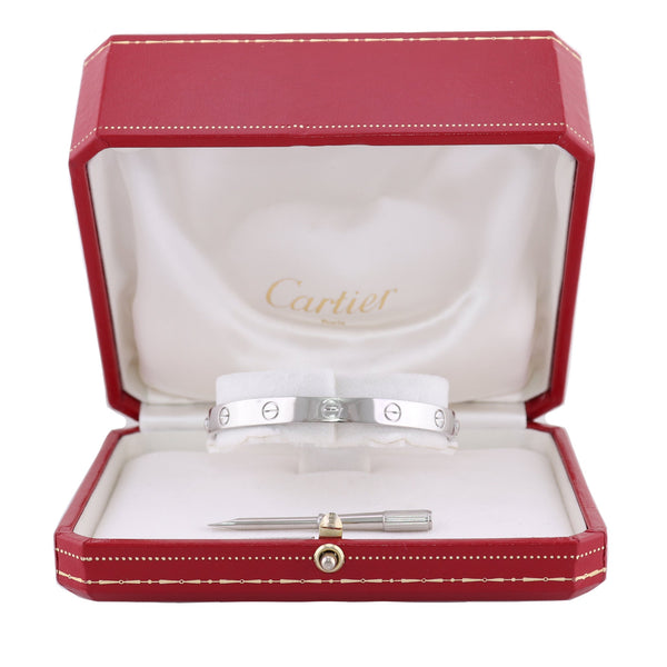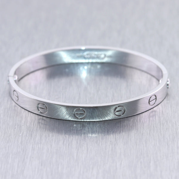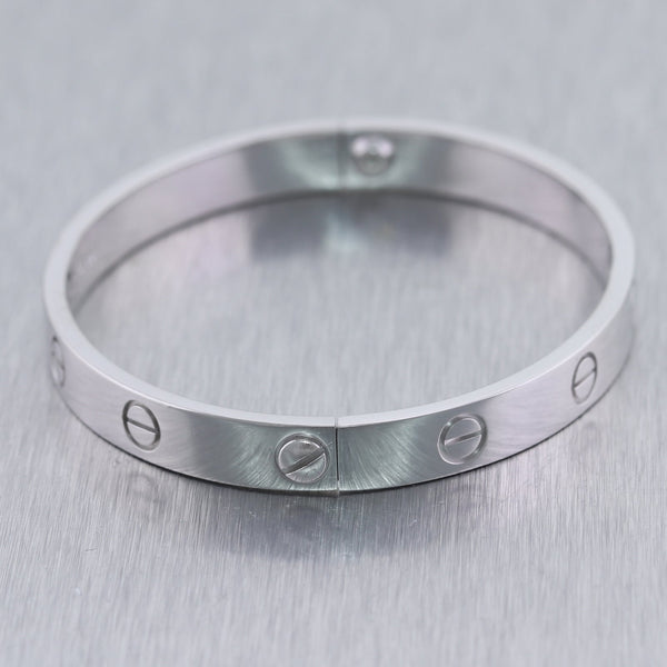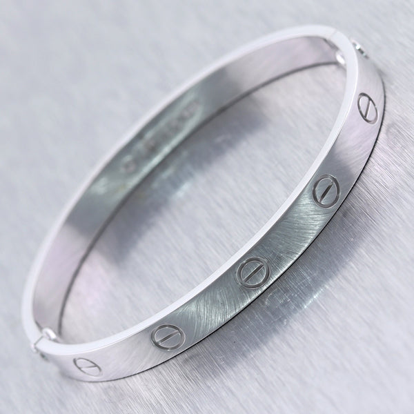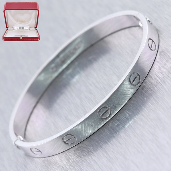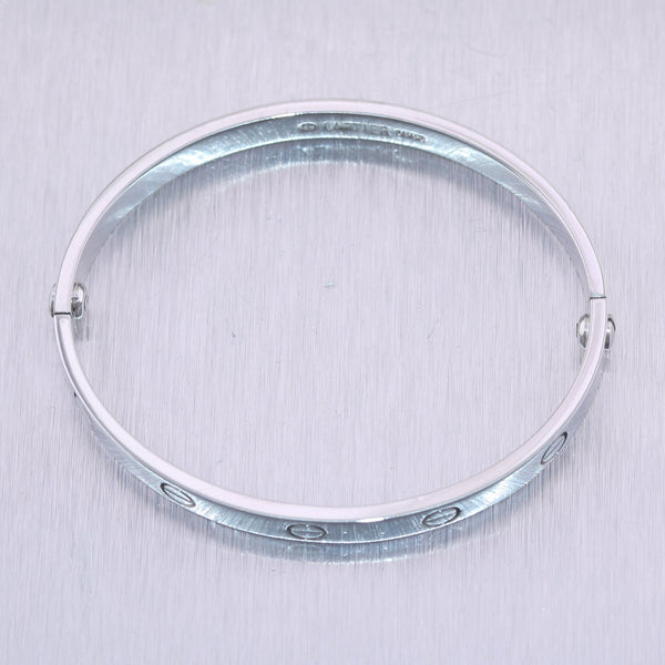 For your consideration, an authentic Cartier 18k White Gold Old Style Love Bangle Bracelet Size 17 Box. Comes complete with all Original Cartier Box, and Screw Driver. This is a Size 17