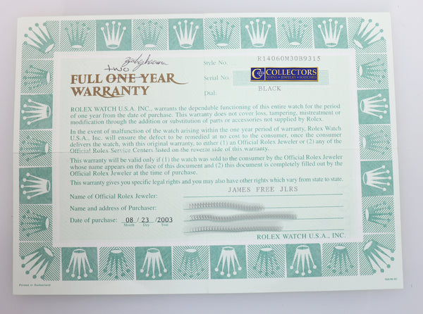 | Papers | Yes, this item will include the Original Rolex Warranty Papers and a Collectors Coins & Jewelry certificate of appraisal and authenticity as per buyer request. |