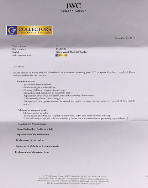 | Serial Number | 28****1 (Fully serviced by IWC in 2017) |