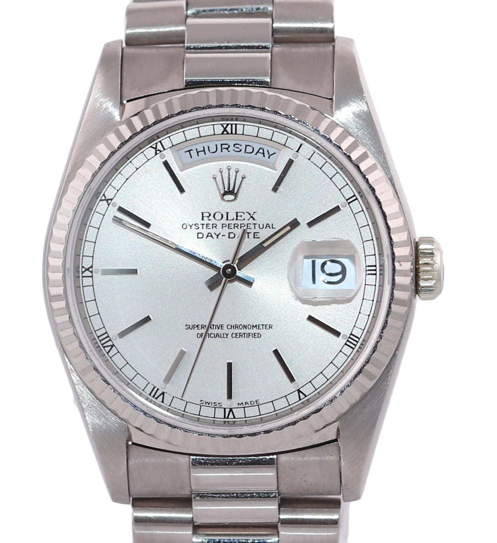 | Dial | Original Rolex Silver Index Dial with the day at the 12 o'clock and the date at the 3 o'clock |