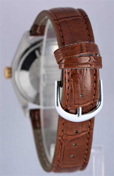 Rolex Date 34mm1505 Two-Tone Stainless Slate Dial "Door Stop" Indices Engine-Turned Gold Leather Band Watch