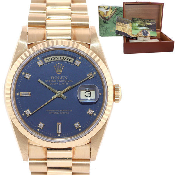 | Dial | Original Rolex Blue Diamond Dial with the day at the 12 o'clock and the date at the 3 o'clock |