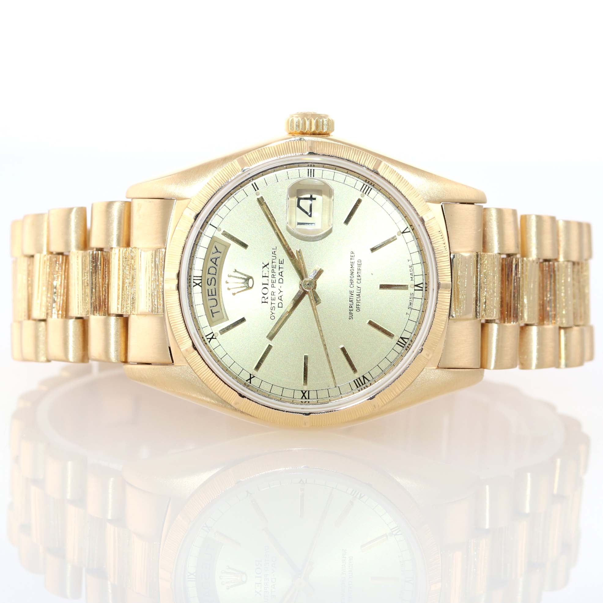 | Bezel | Original Rolex 18k Yellow Gold Bark Bezel. |