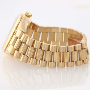 | Band | Original Rolex 18K Yellow Gold Presidential Link Bark Bracelet with a Folding Crownclasp; bracelet has some light stretch from use. |
