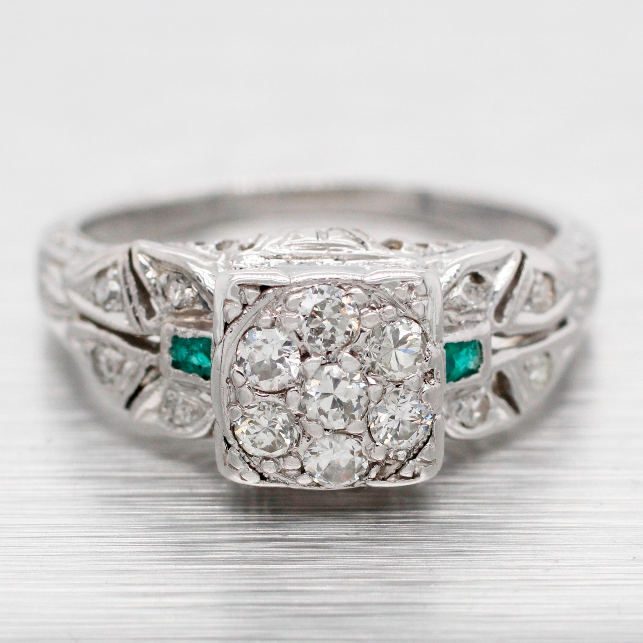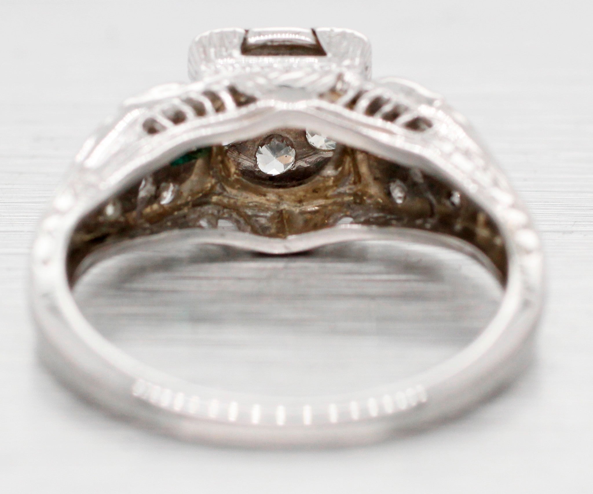 Antique Art Deco 0.25ctw Diamond & Emerald Nature Band Ring - 14k White Gold