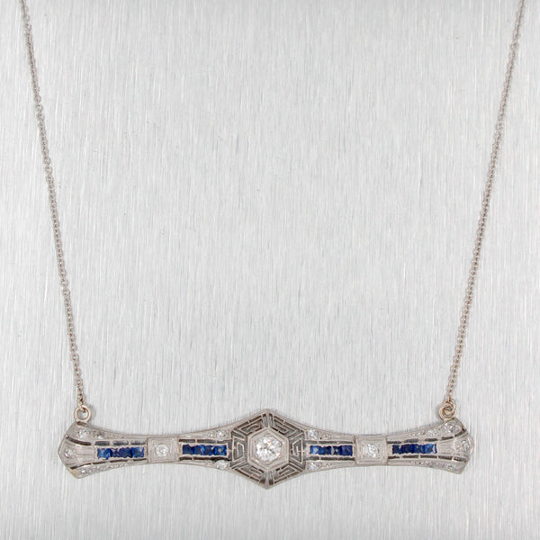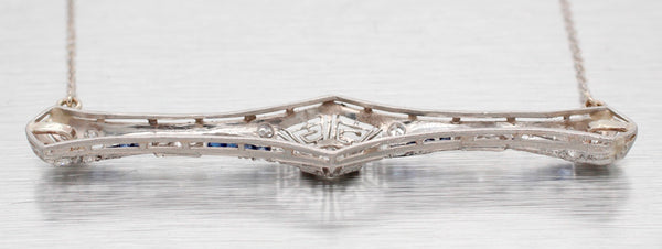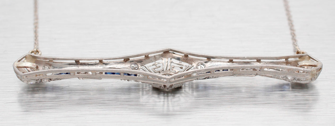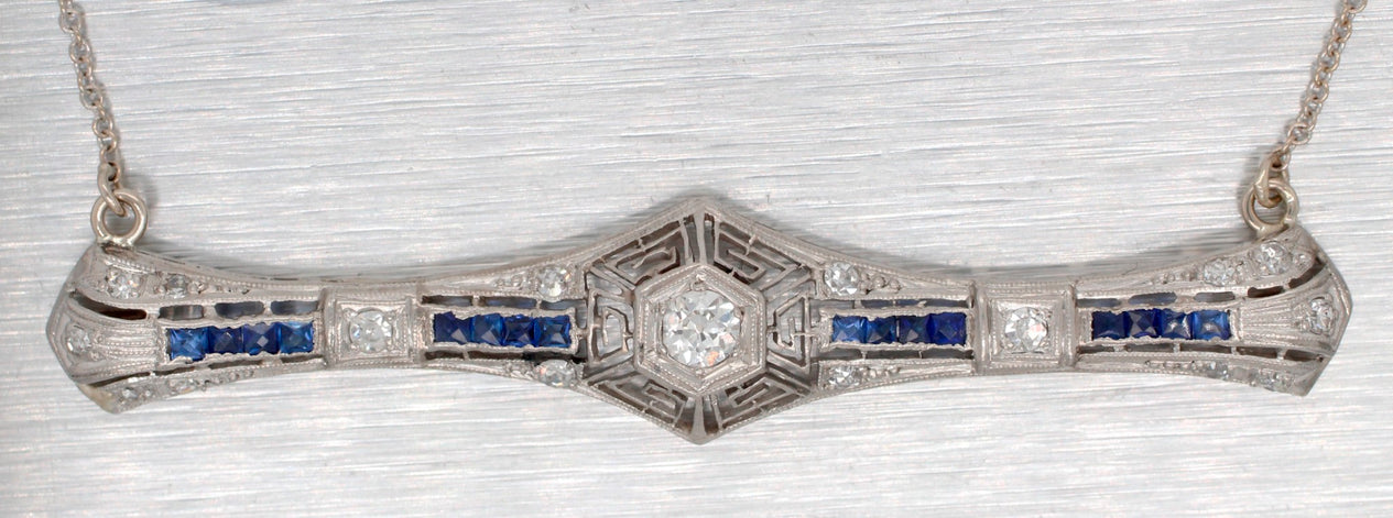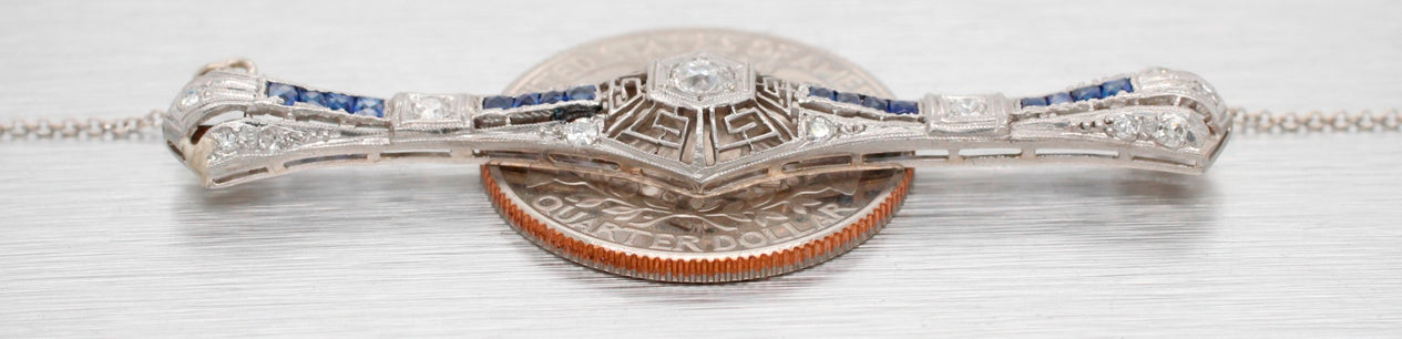 This gorgeous art deco pendant features an intricate row of alternating diamonds and sapphires, surrounded by beautiful Greek key style filigree work. This platinum pendant was once an antique brooch that has been slightly modified to now wear on a necklace. The sleek cable link chain necklace is crafted from solid 14k white gold.