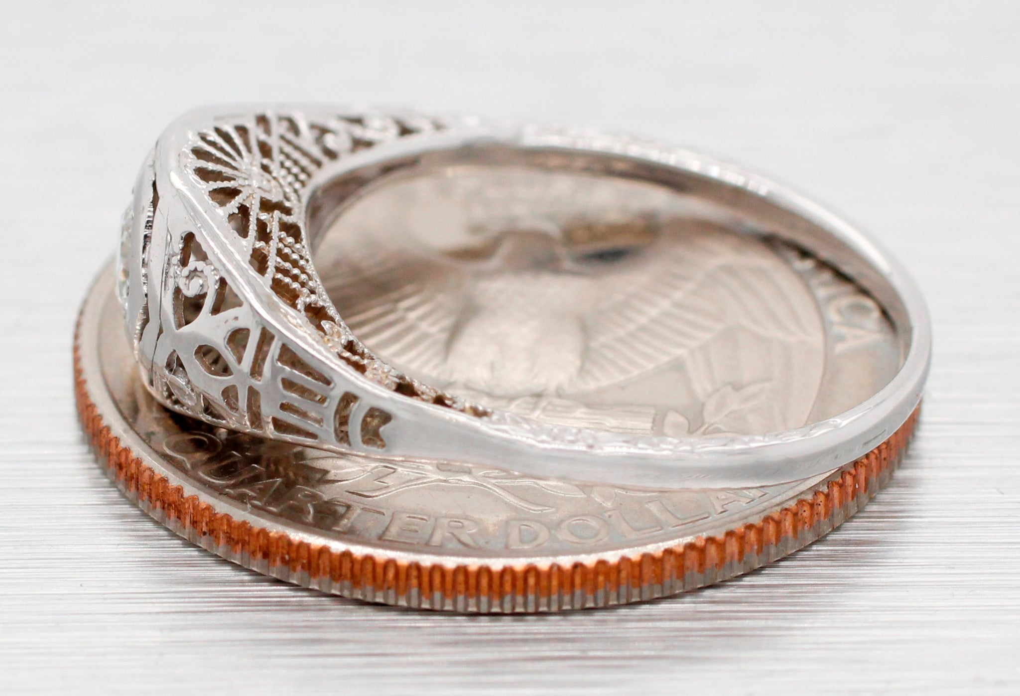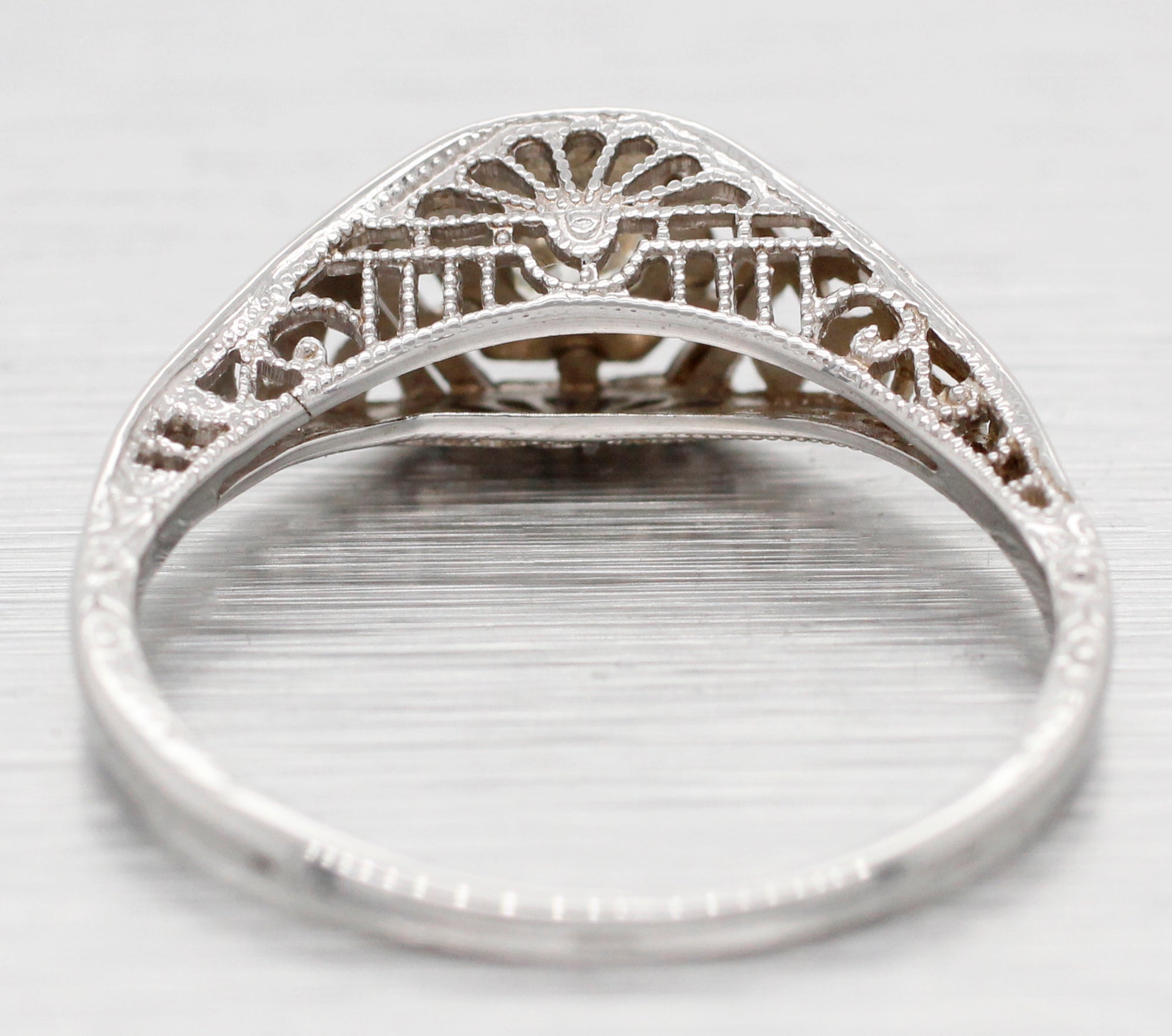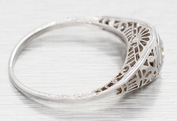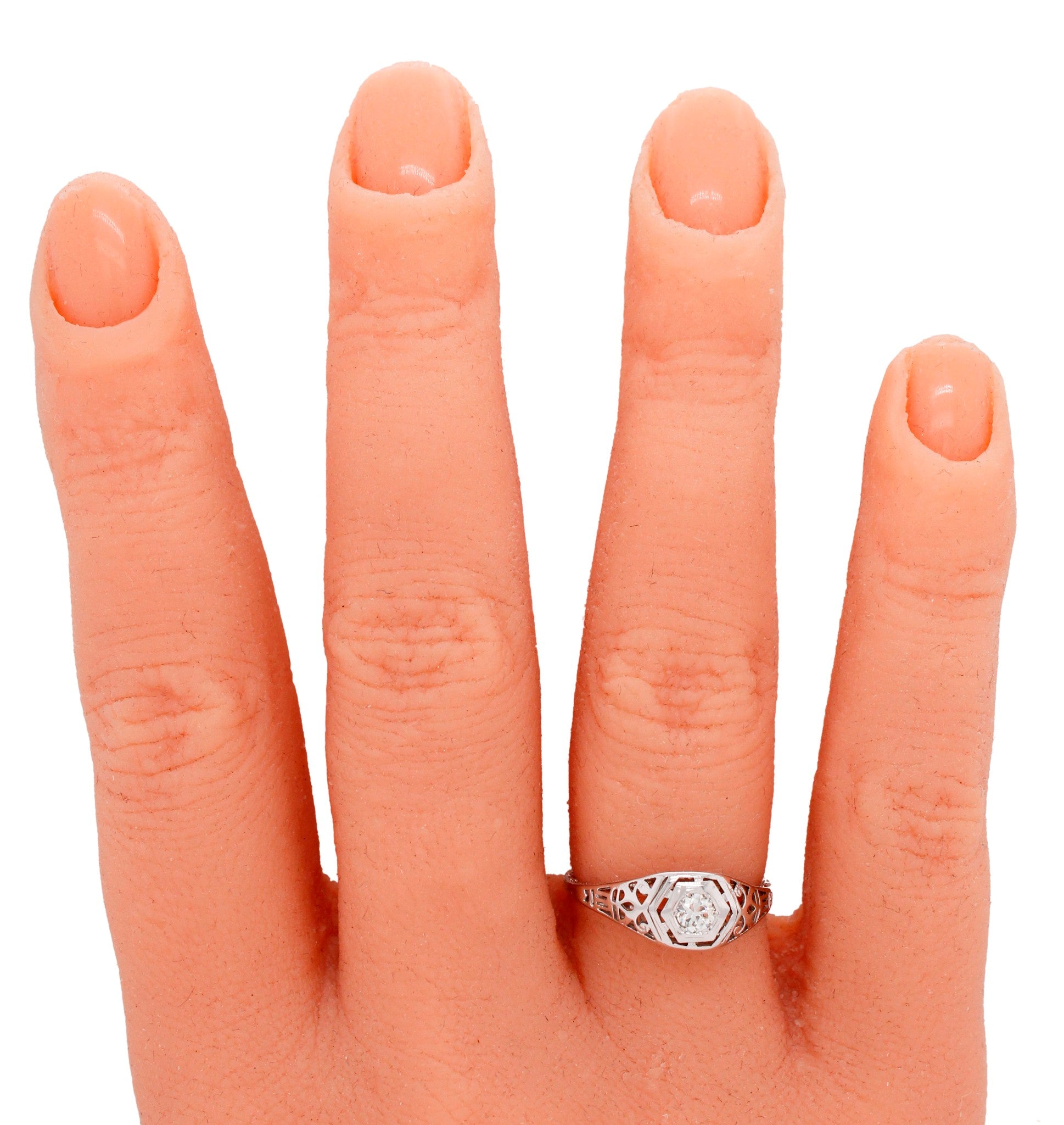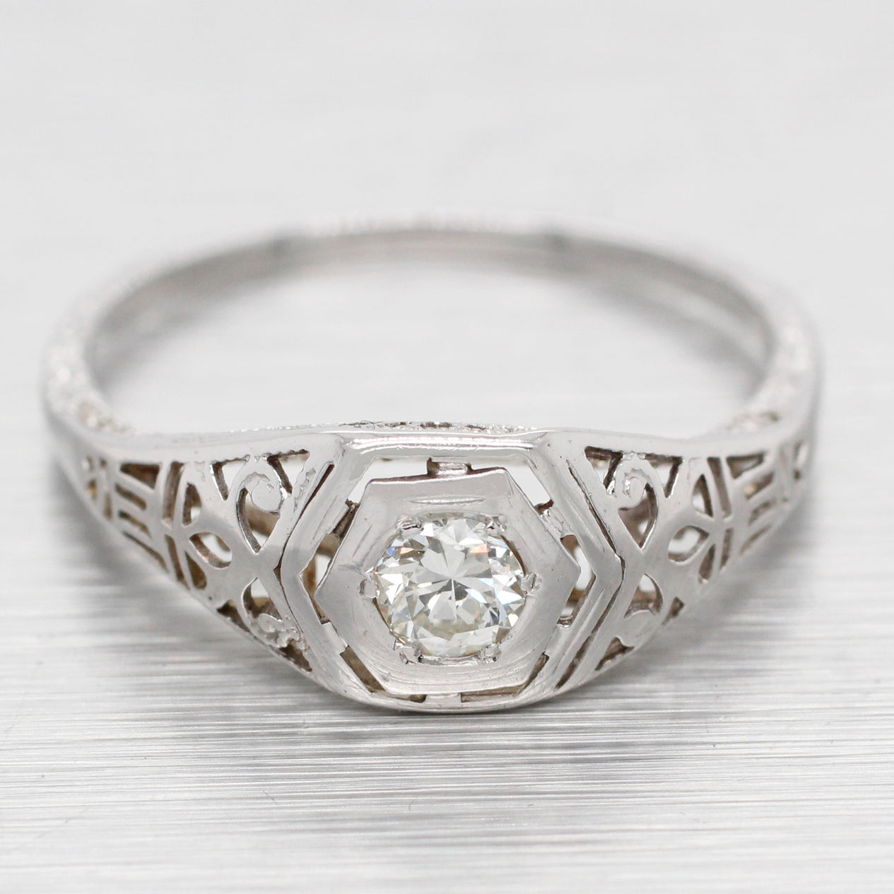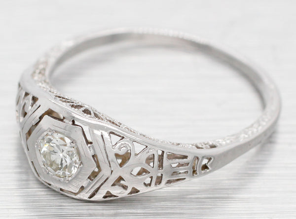 Antique Art Deco Solitaire 0.15ct Diamond Hexagon Band Ring - 14k White Gold