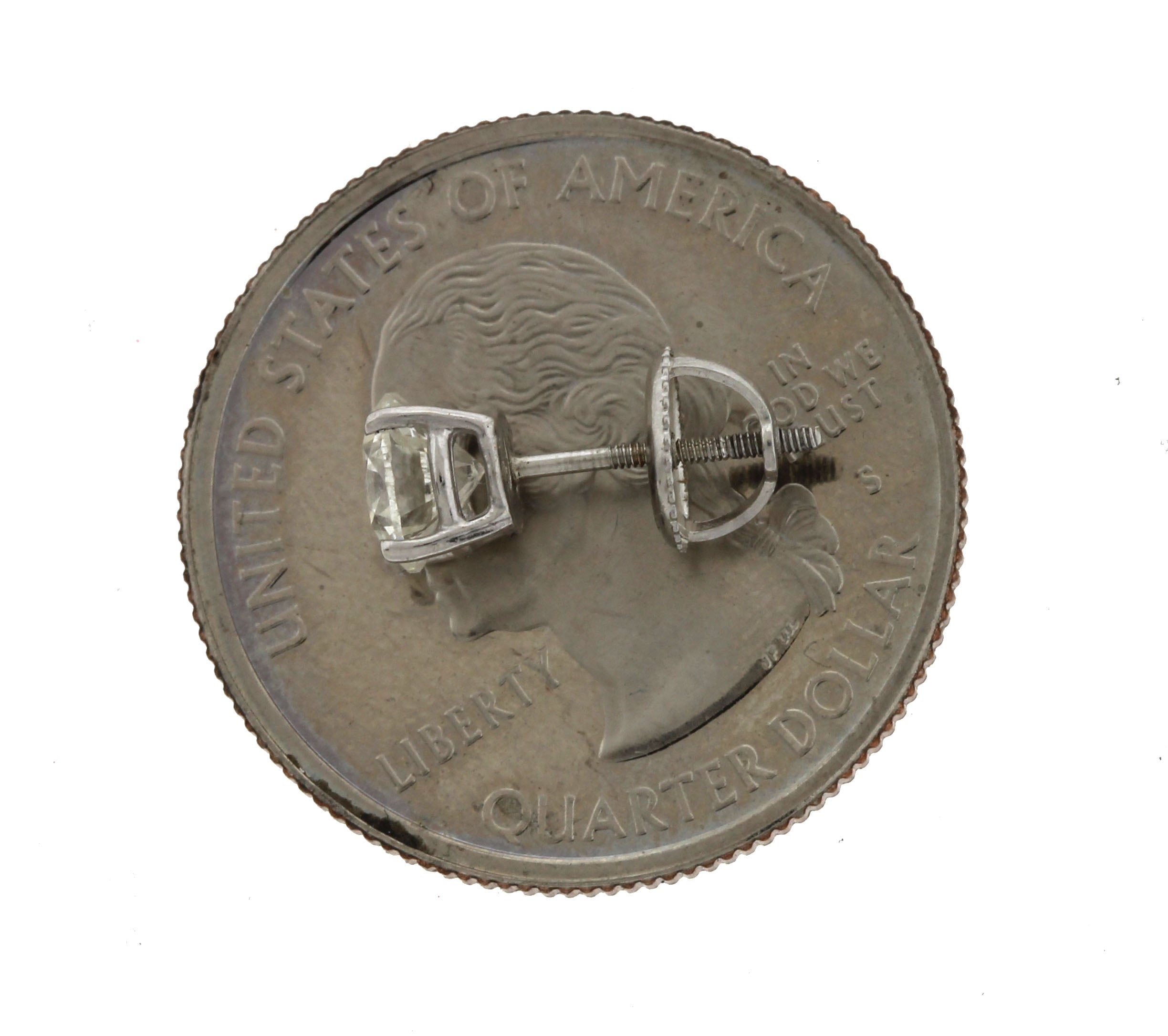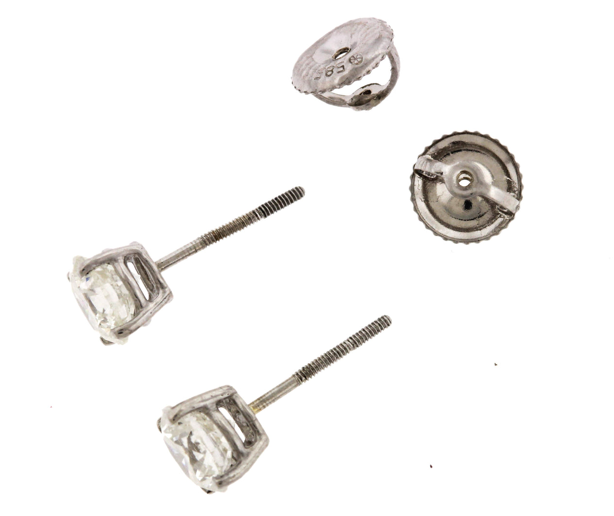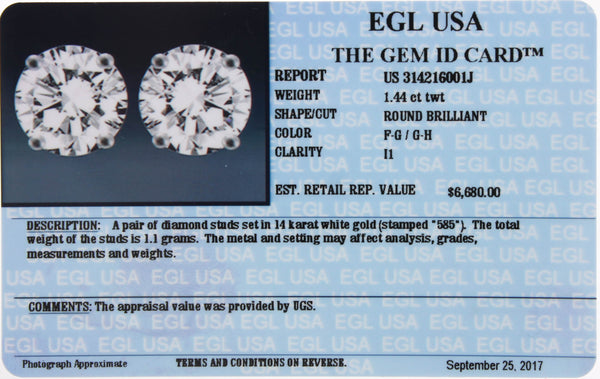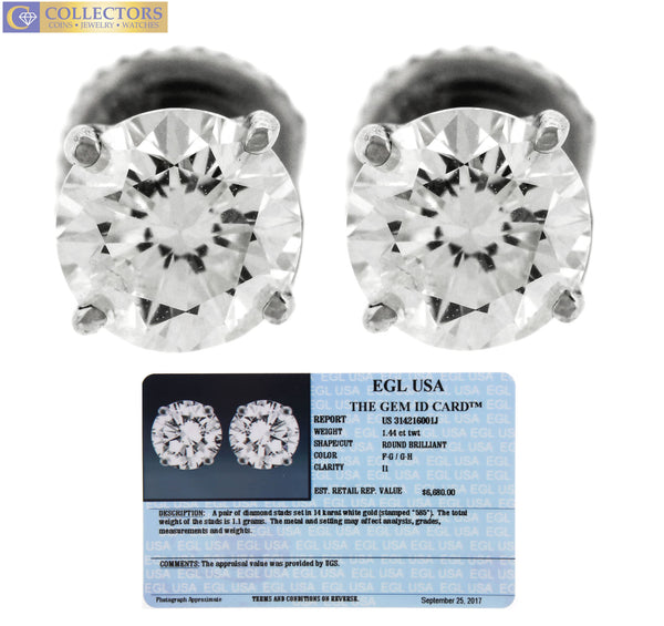 Modern 14K 585 White Gold 1.44ctw Round Brilliant Diamond Stud Earrings EGL USA