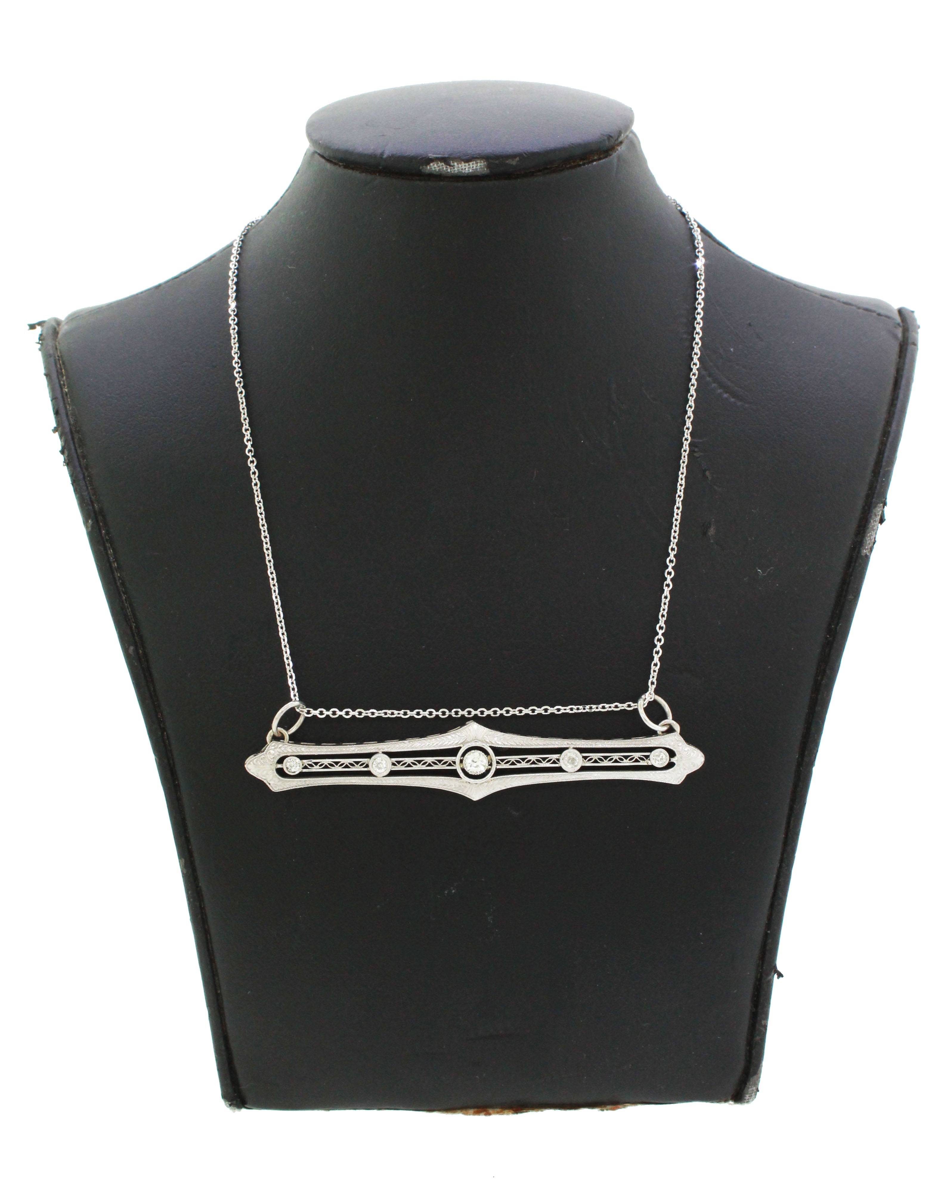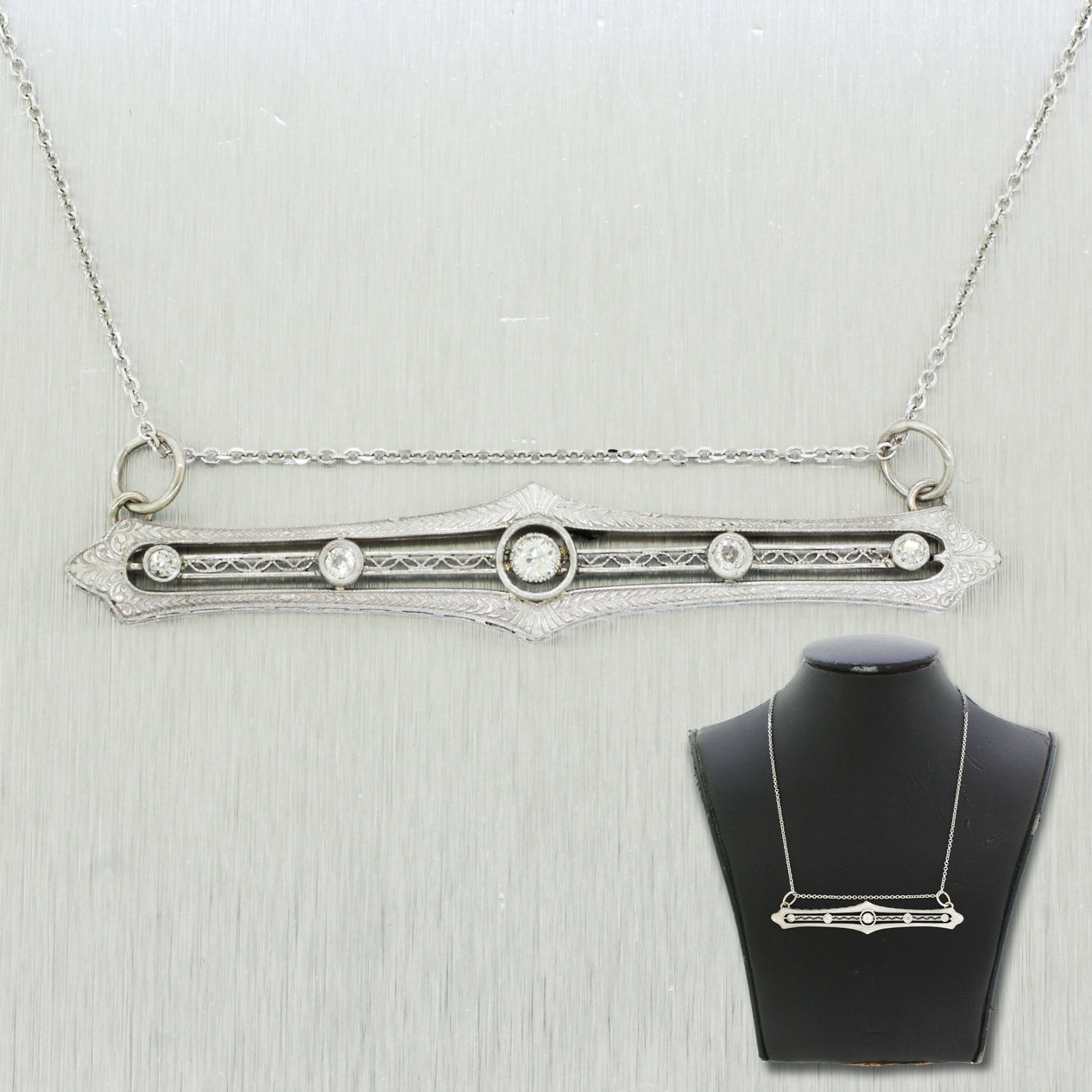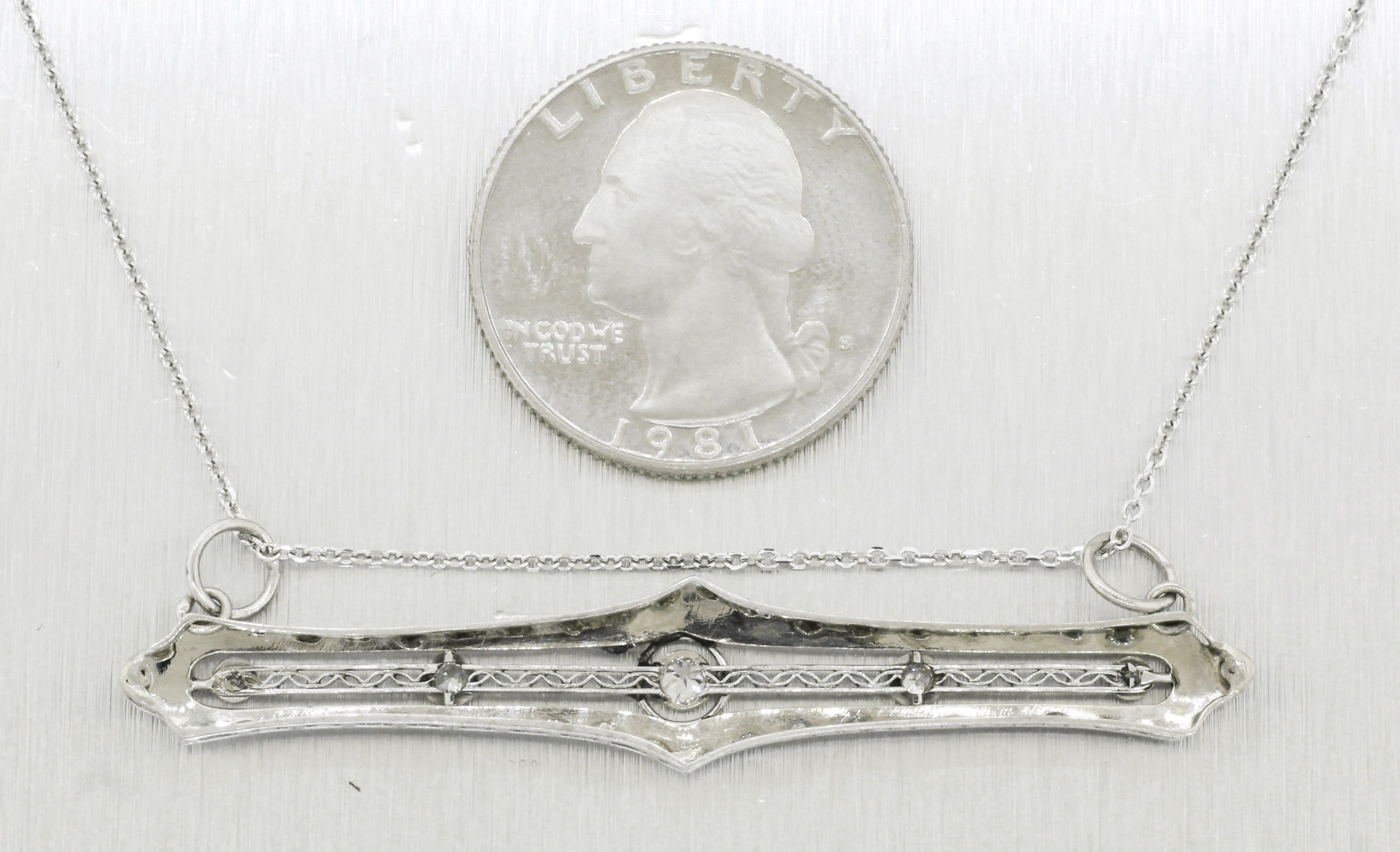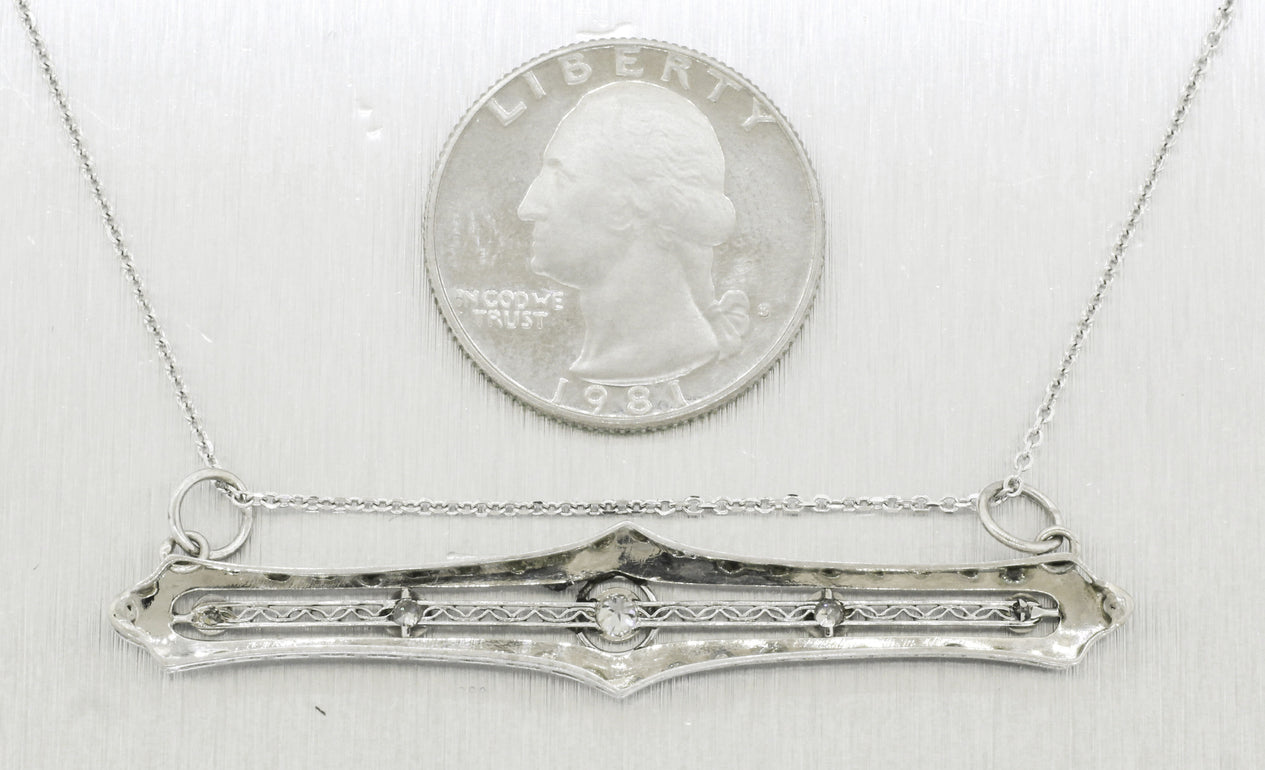 For your consideration, a 1930's Antique Art Deco 14k Solid White Gold 18" 0.45ctw Diamond Filigree Bar Necklace. This item was originally a pin but was altered to allow a chain attachment to become a necklace. It will come professionally packaged and unconditional 14 day money back return policy.