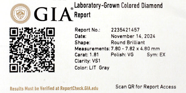 Color: Light Gray Clarity: VS1 Carat Weight Total: 1.81ct Cut Shape: Round Brilliant Measurements: 7.80 - 7.82 x 4.80�mm |