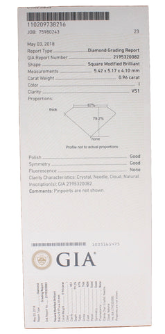 GIA Certified 0.96ct Loose Square Modified Brilliant Princess Cut Diamond I VS1