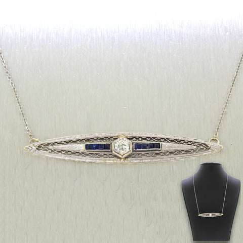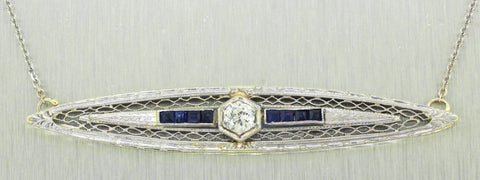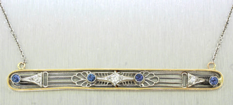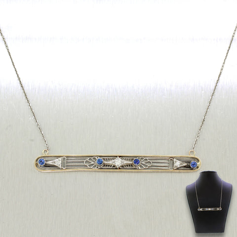 1920s Antique Art Deco 14k Gold 0.25ct Diamond & Sapphire Bar Necklace