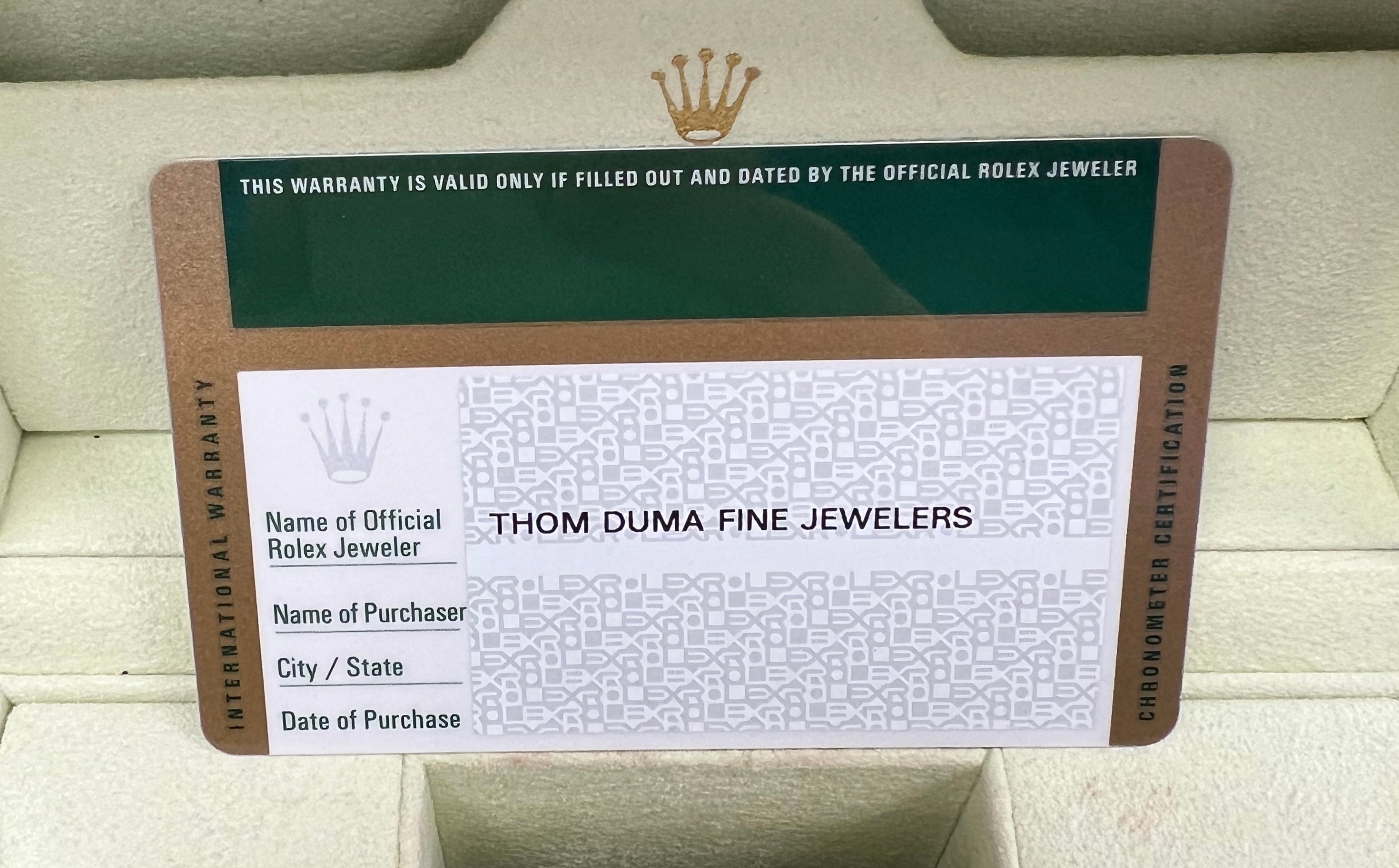 | Serial Number | Randomized Eight-Digit Serial (The Rolex warranty card is undated / unnamed!) |
