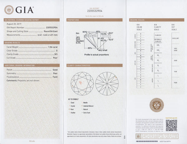 This is a beautiful 1.06ct GIA Certified Round Shape Brilliant Cut G SI1 Natural Modern Diamond. This diamond was graded by GIA, one of the most reputable diamond grading organizations in the world.