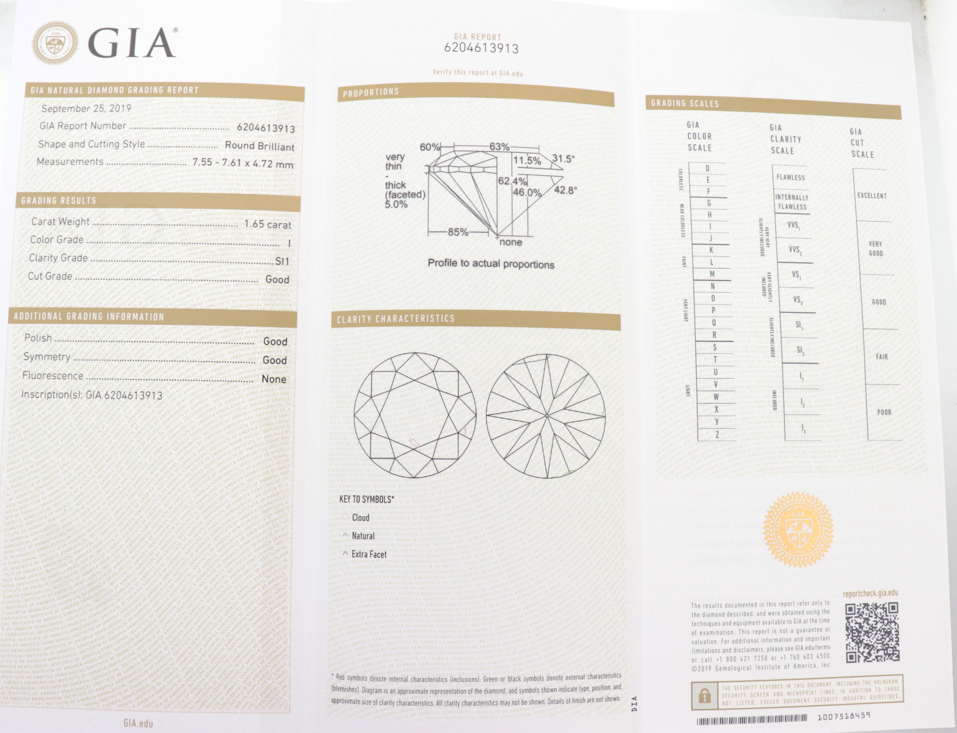 1.65ct GIA Round Shape Brilliant Cut I SI1 Natural Modern Loose Diamond