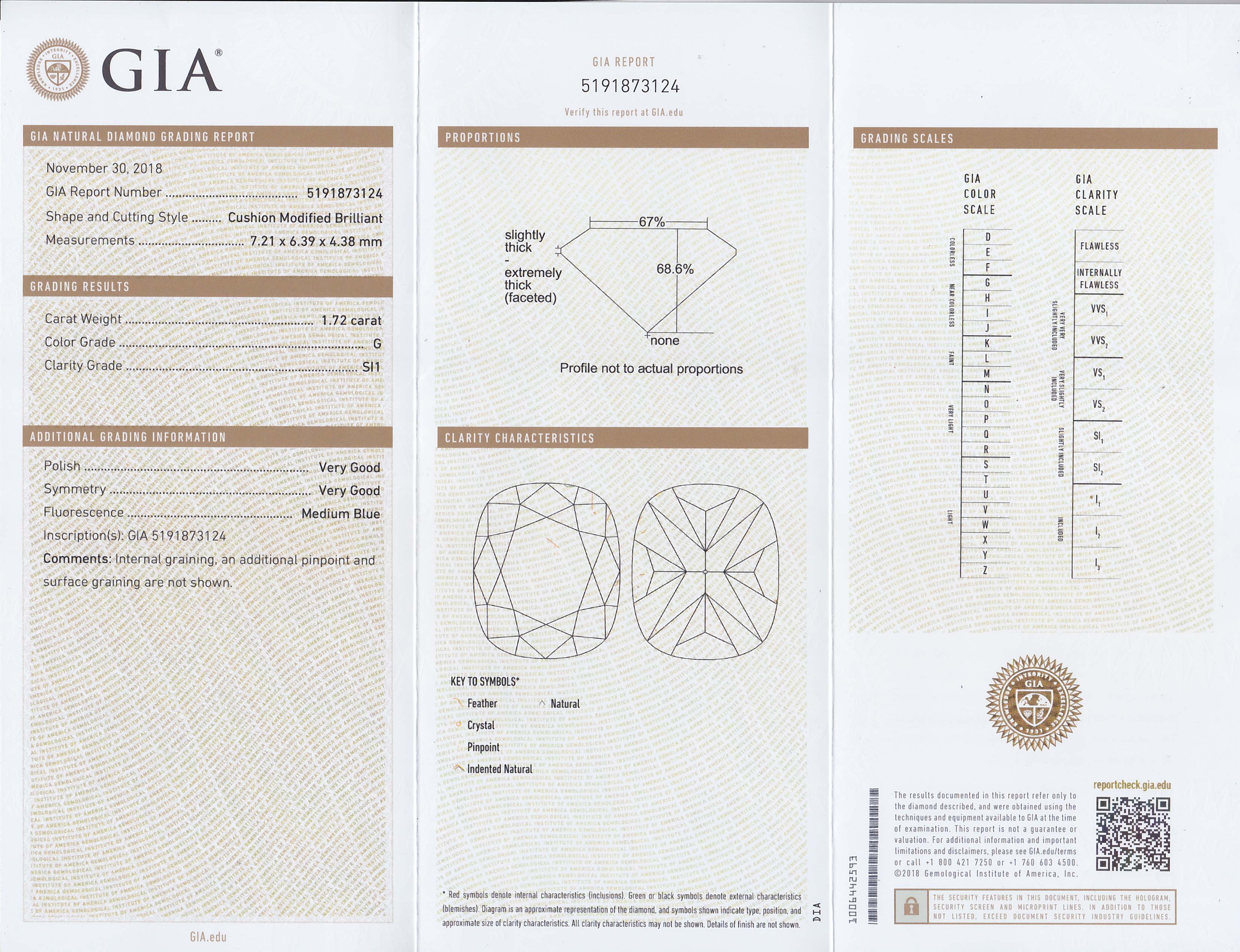 This is a natural 1.72ct Cushion Brilliant Cut G Color SI1 Clarity Loose Diamond. This diamond was graded by GIA, one of the most reputable diamond grading organizations in the world.