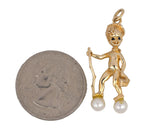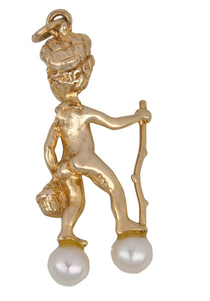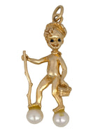 14K Solid Yellow Gold Hiking Stick Boy Figurine Pearl Charm Pendant 5.3gr