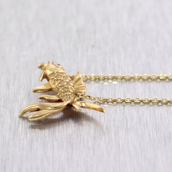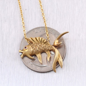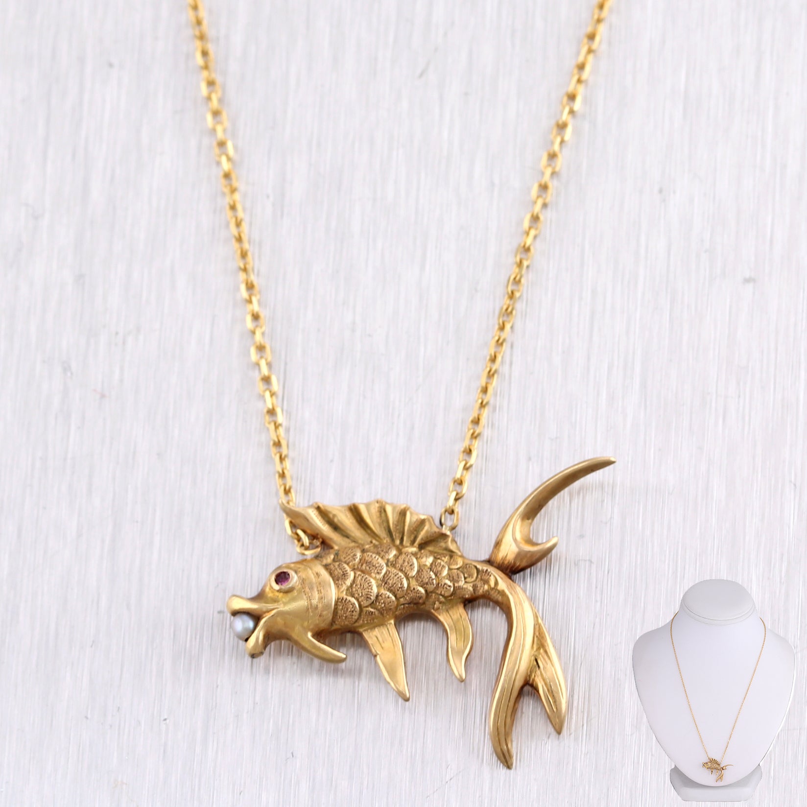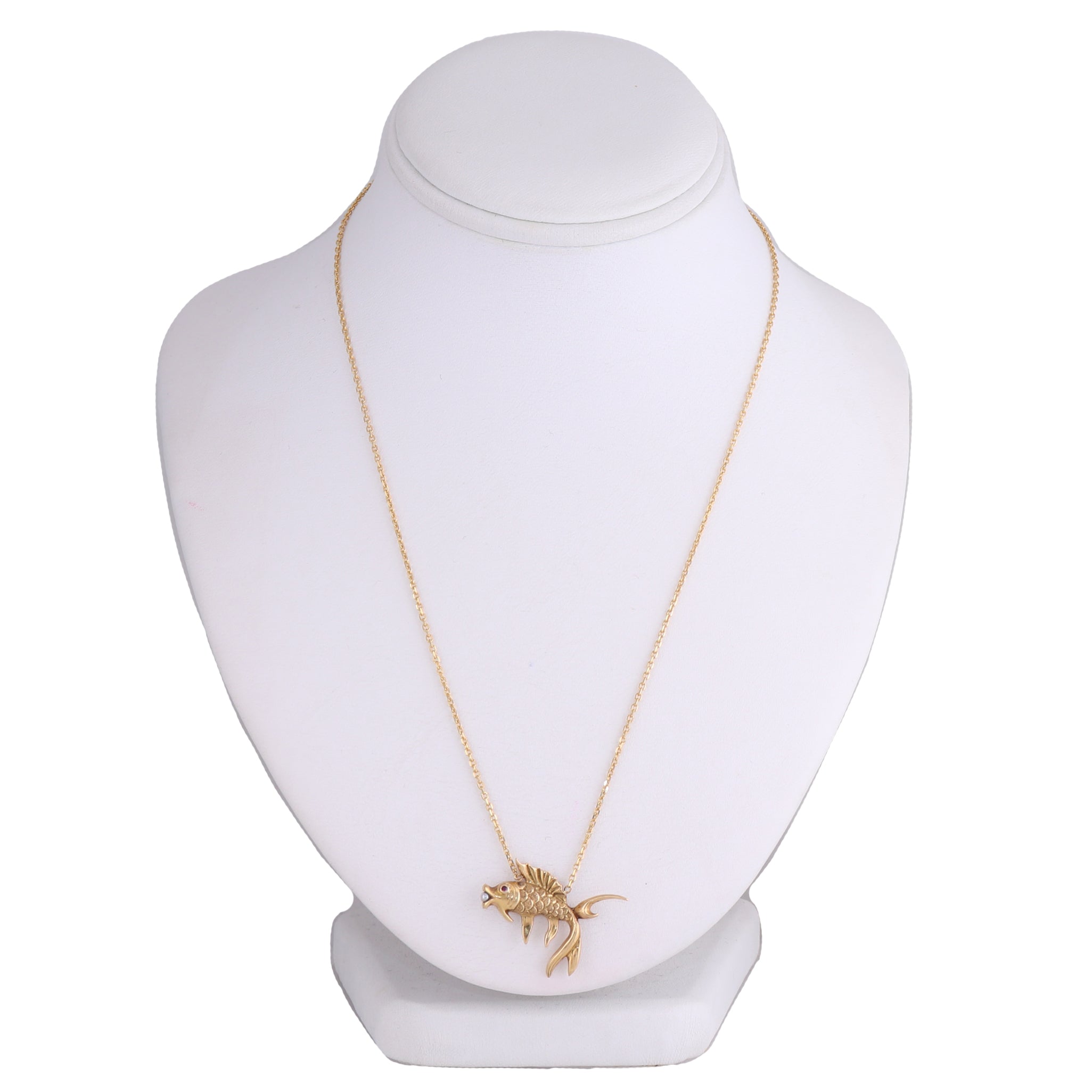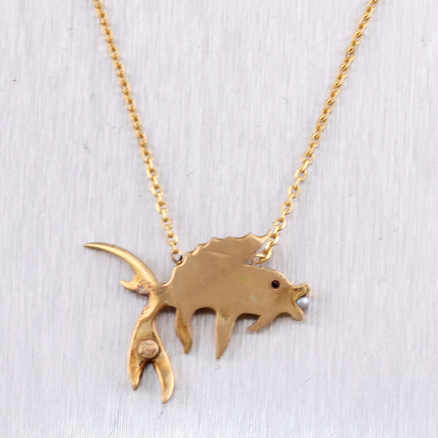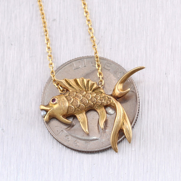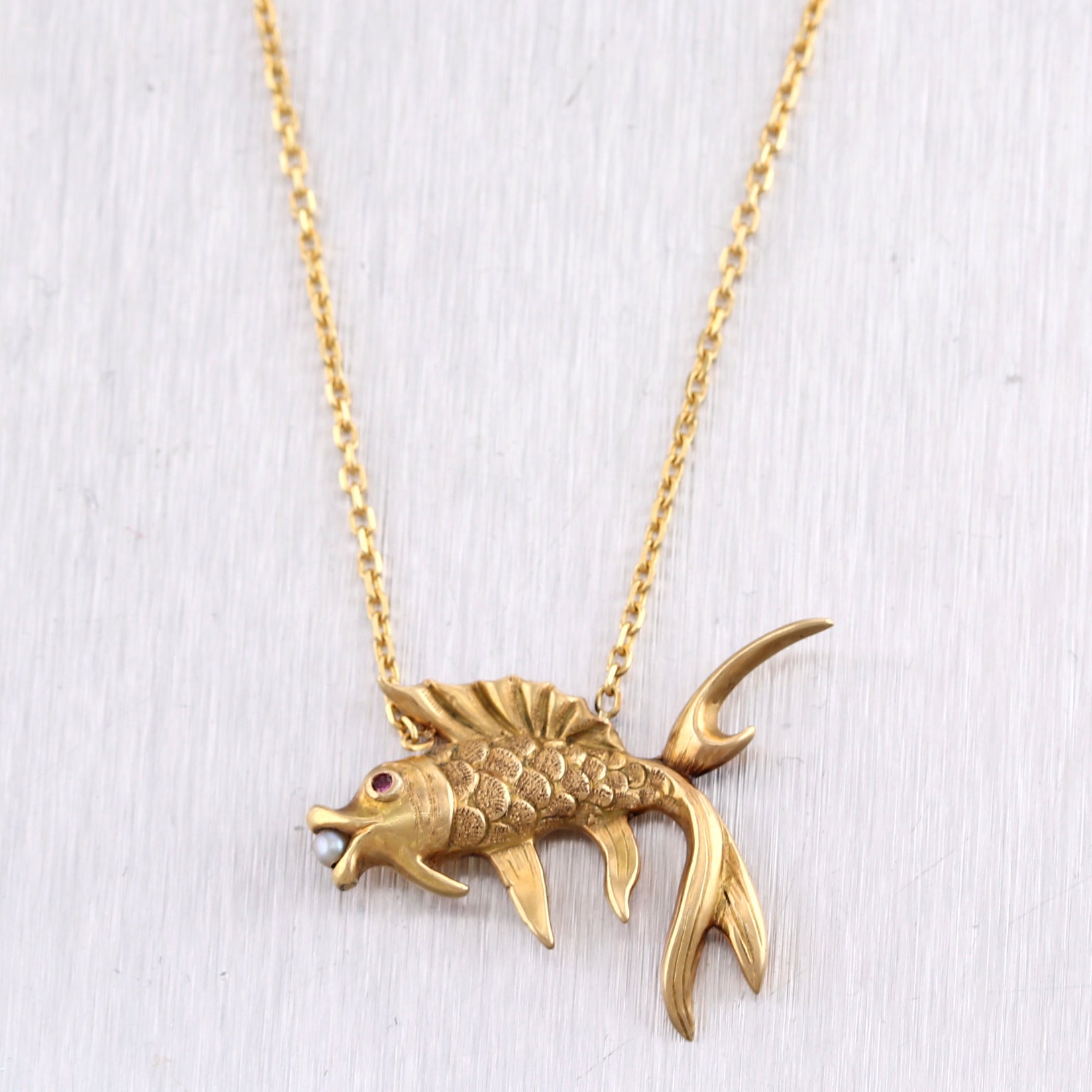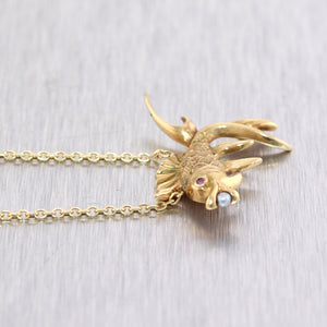 For your consideration, an authentic 1890's Antique Victorian 14k Yellow Gold Ruby & Seed Pearl Pieces Fish 18" Necklace. This necklace will come in a lovely jewelry box for a perfect presentation and our unconditional 30 day money back return policy. K1