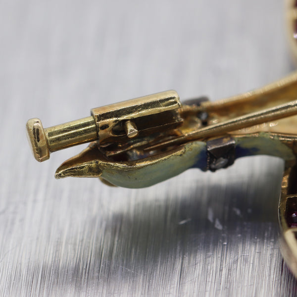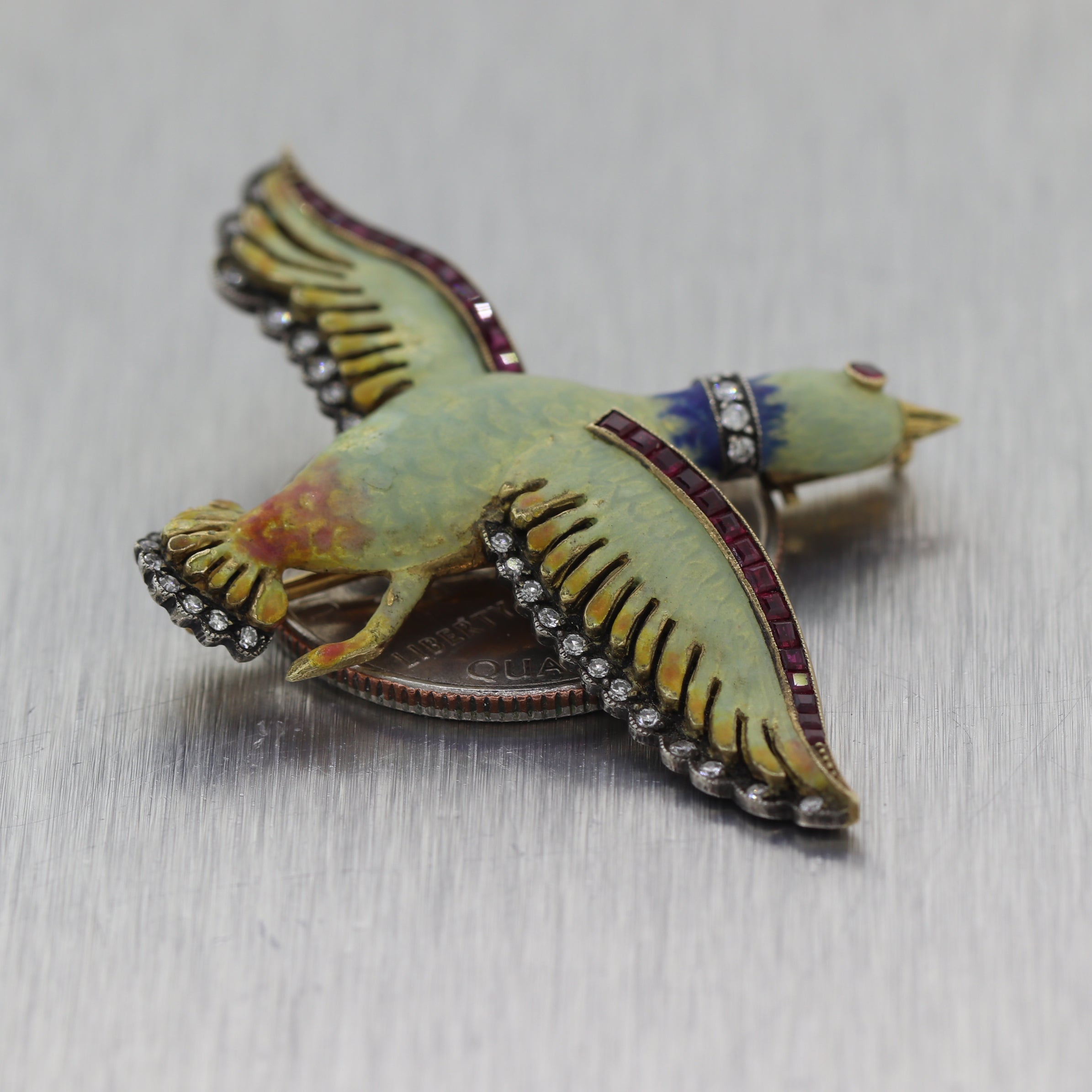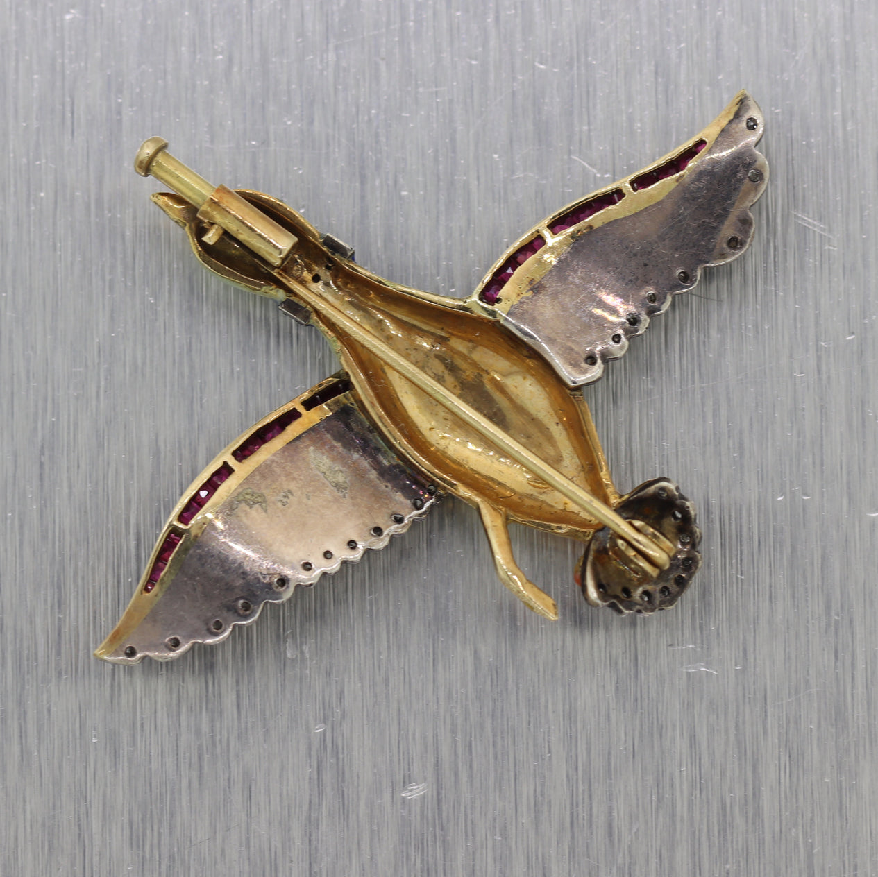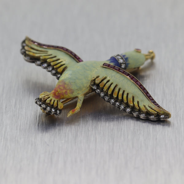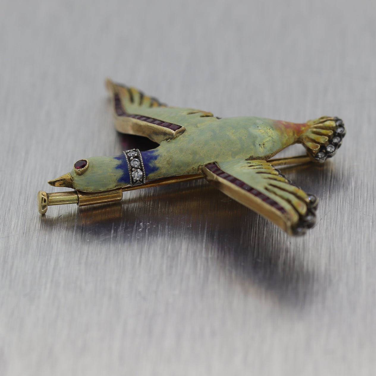 For your consideration, an authentic 1890's Antique Victorian 18k Yellow Gold & Sterling Silver Enamel & Diamond Bird Pin. This item will come in a lovely jewelry box for a perfect presentation and our unconditional 30 day money back return policy. C0