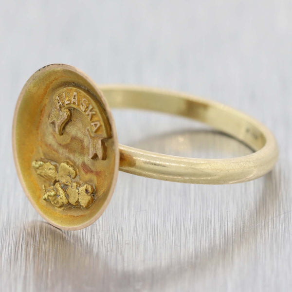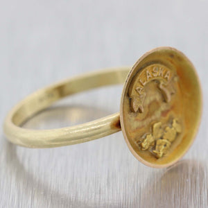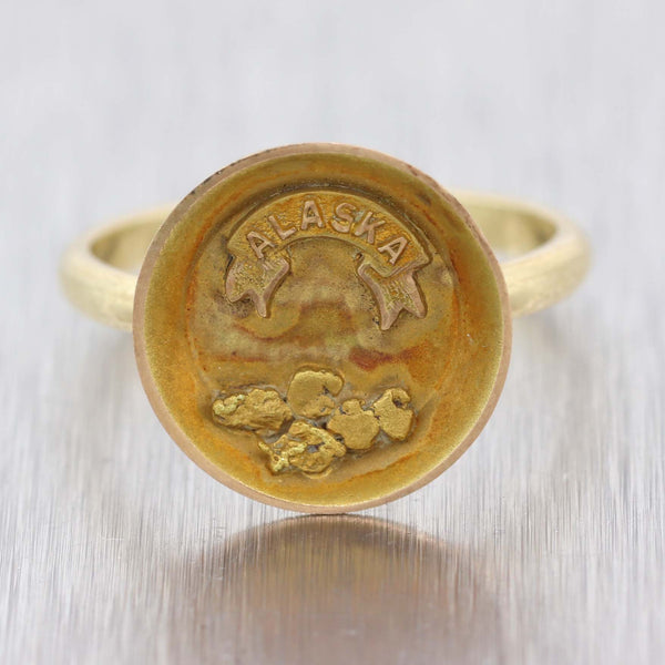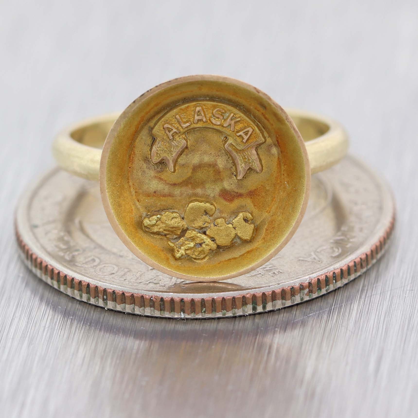For your consideration, an authentic 1890s Antique Victorian Alaska 14K Yellow Gold Panning Souvenir Ring. This ring also has 24K gold flakes. Will come professionally packaged in a beautiful ring gift presentation box.