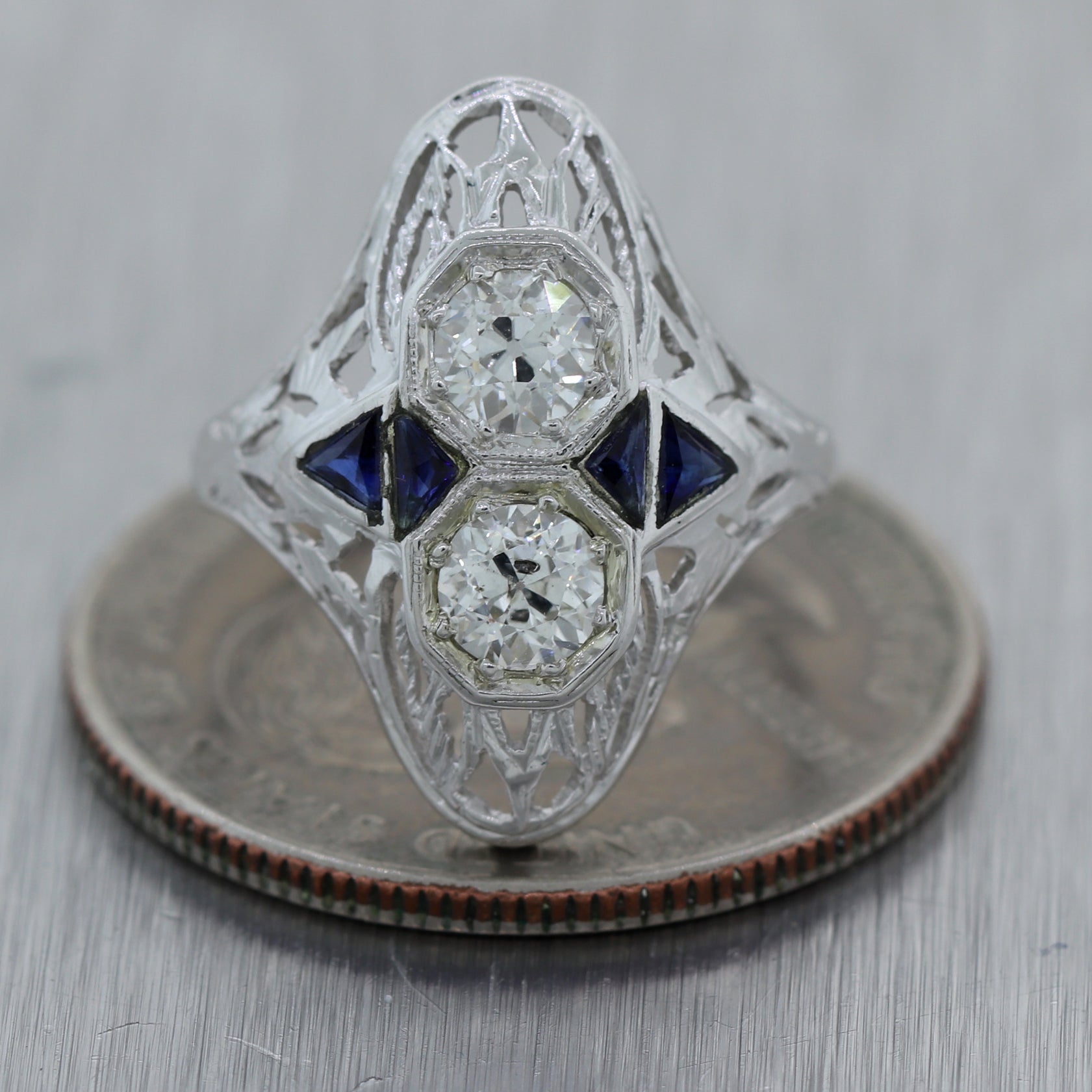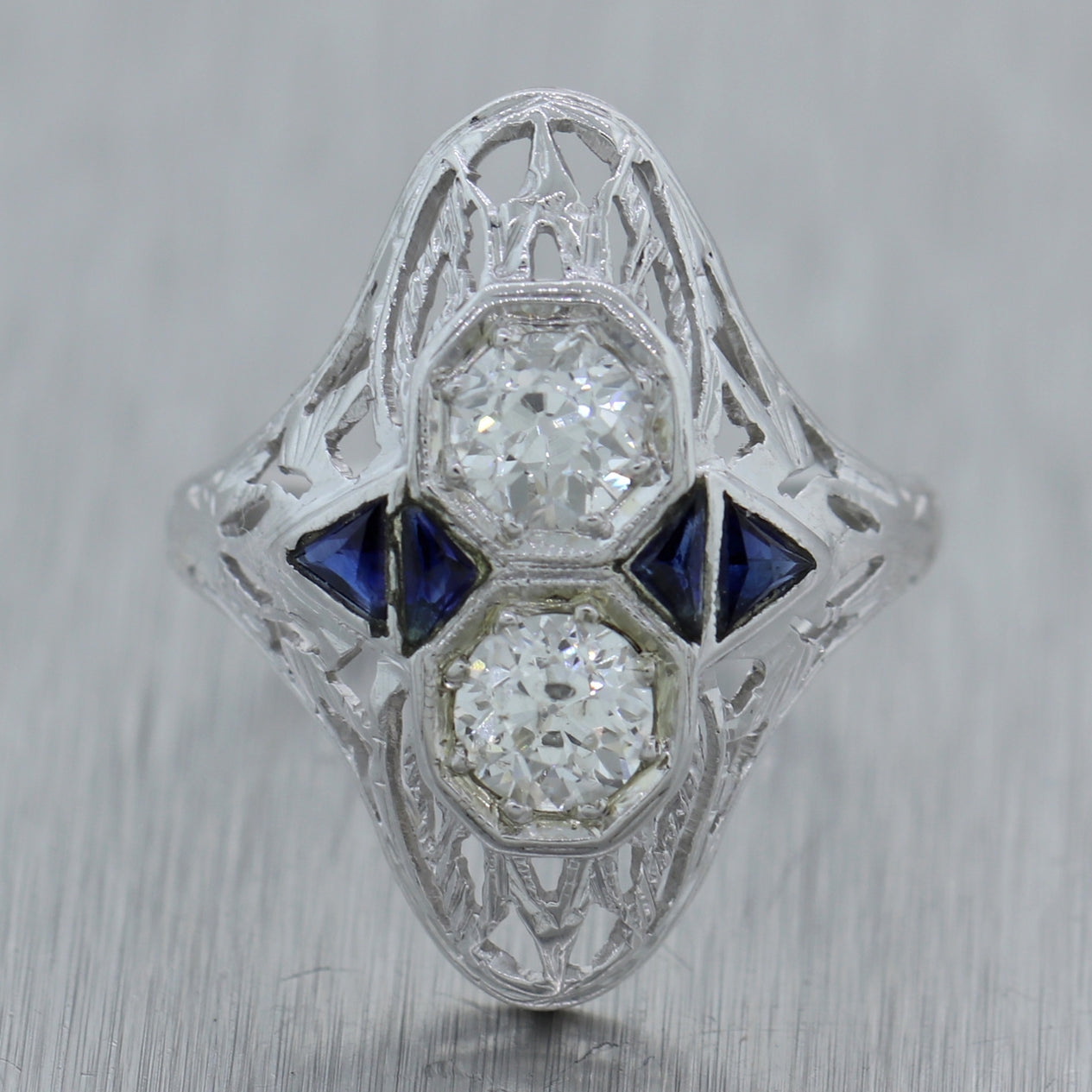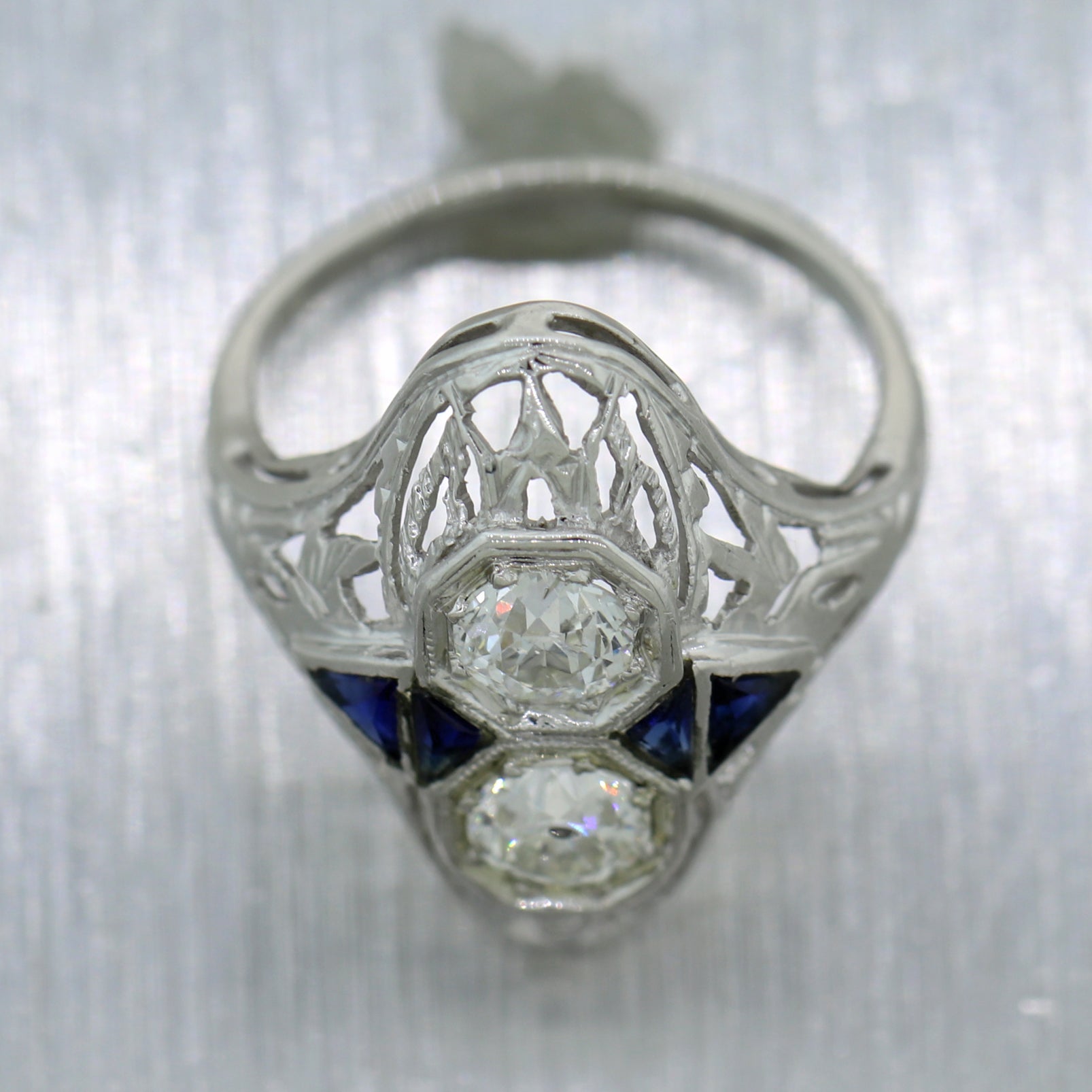 This is a beautiful 1930s Antique Art Deco Estate 18k Solid White Gold 0.42ctw Diamond Sapphire Filigree Ring. It will come in a lovely ring box for a perfect presentation and our unconditional 30 day money back return policy.
