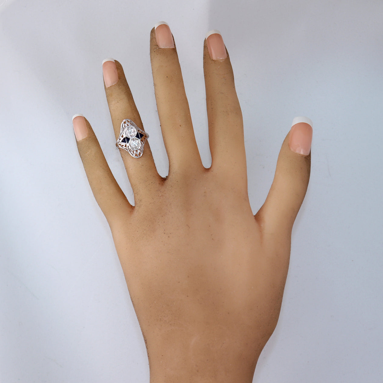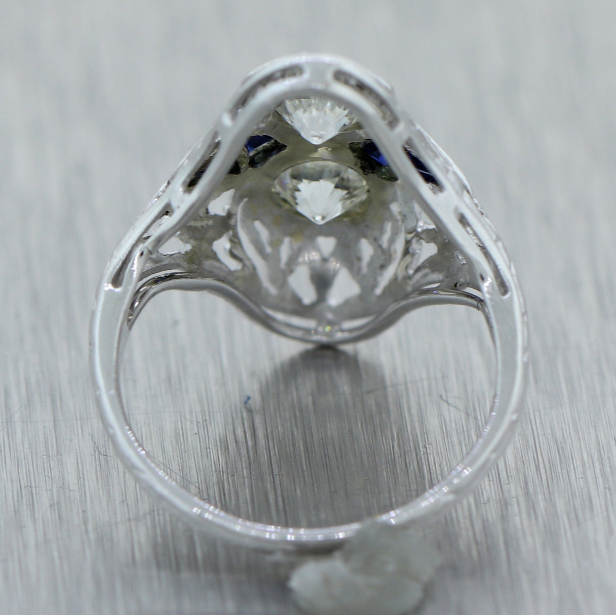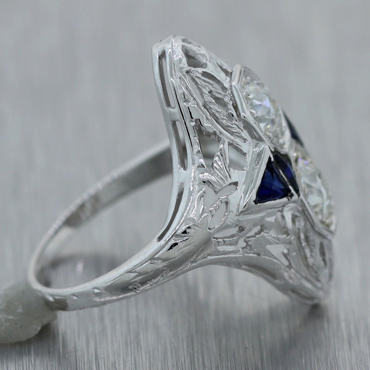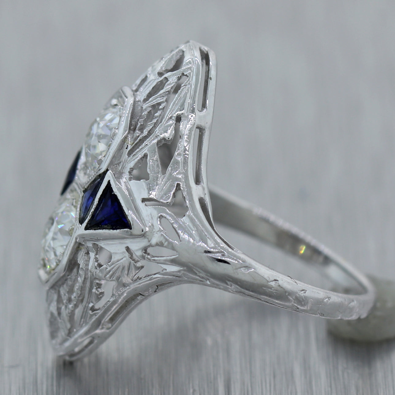 This is a beautiful 1930s Antique Art Deco Estate 18k Solid White Gold 0.42ctw Diamond Sapphire Filigree Ring. It will come in a lovely ring box for a perfect presentation and our unconditional 30 day money back return policy.