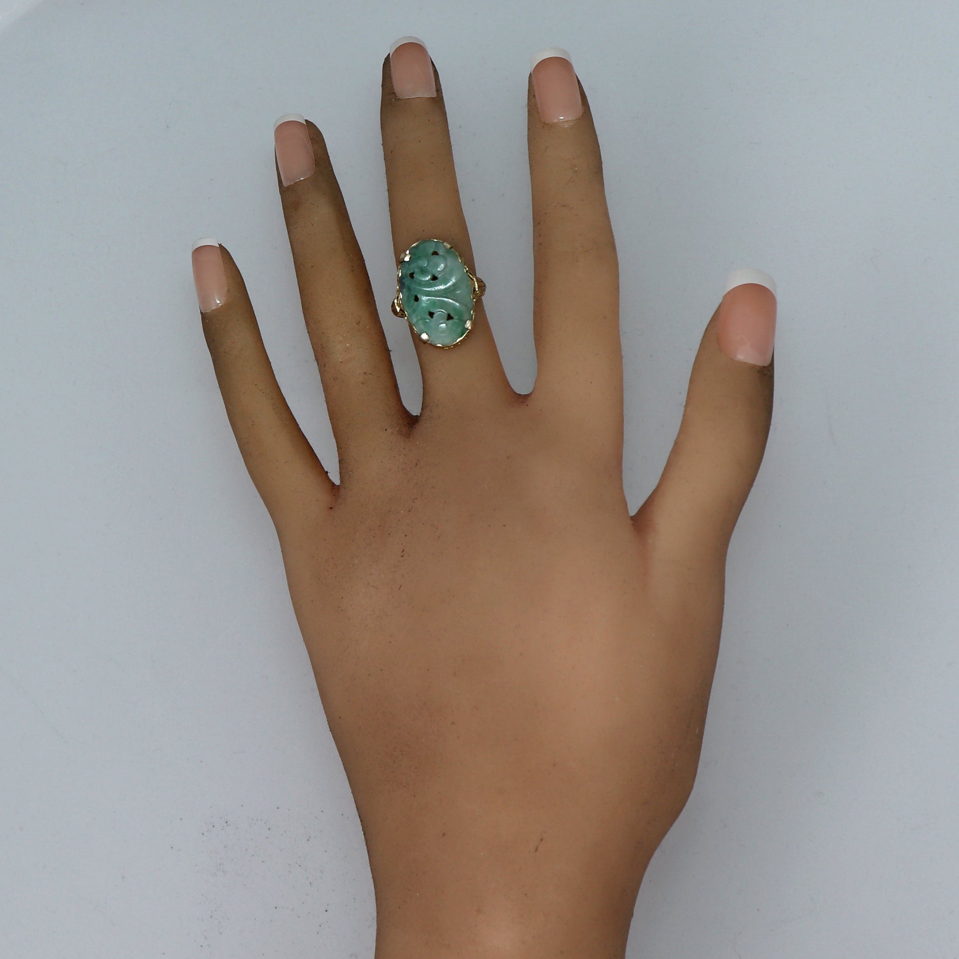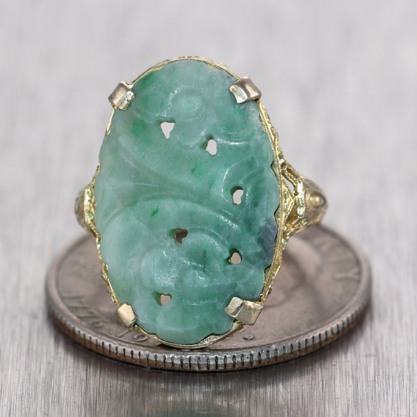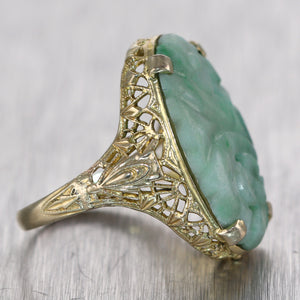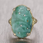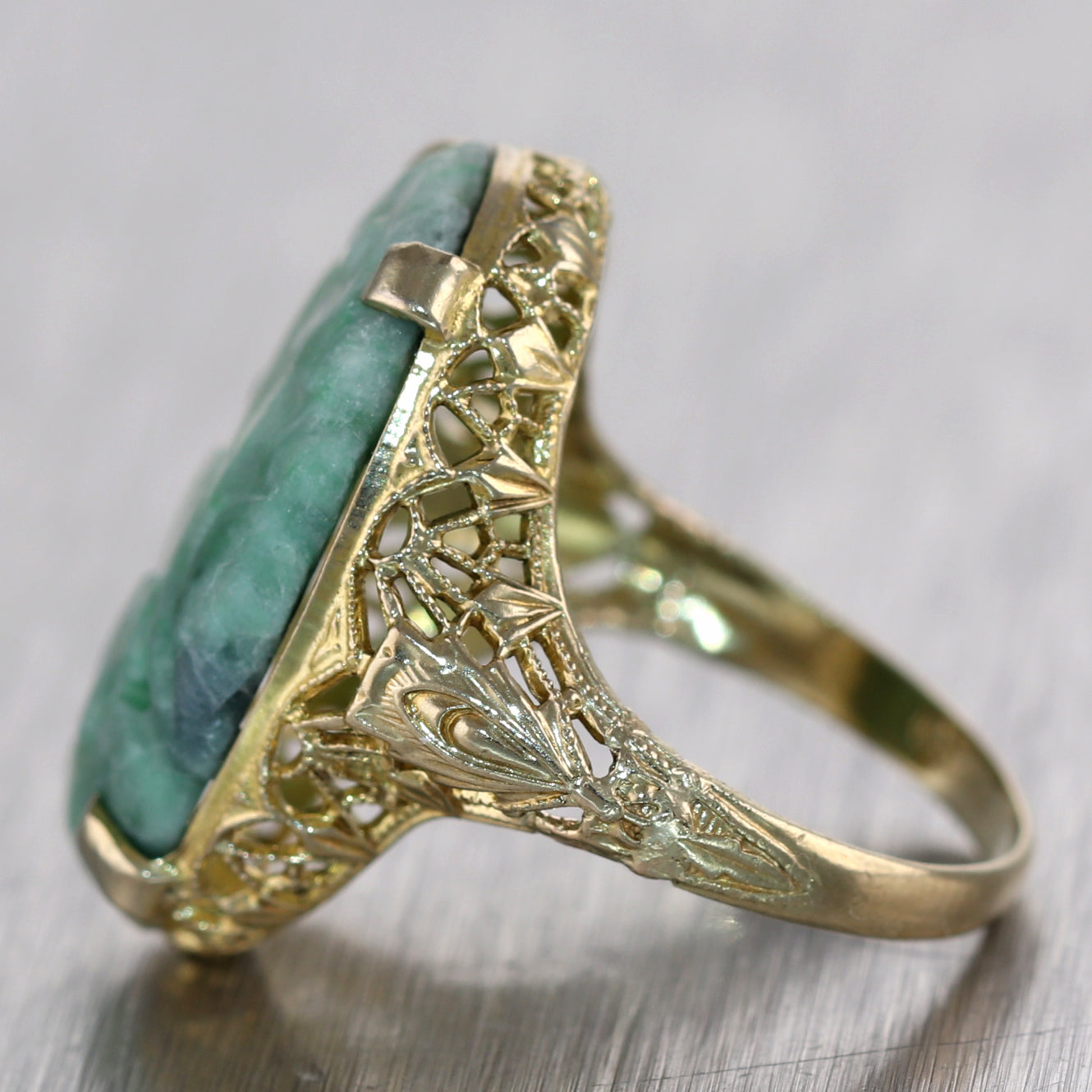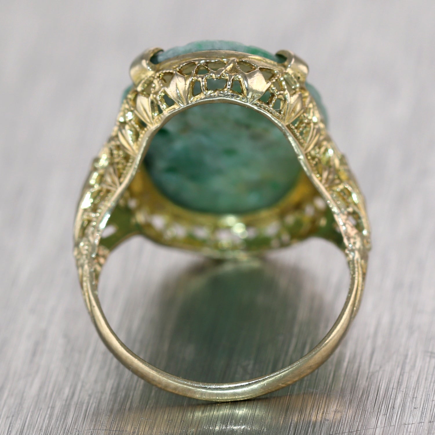For your consideration, an authentic 1930's Antique Art Deco Victorian Style 14k Yellow Gold Carved Jade Cocktail Ring. It will come in a lovely ring box for a perfect presentation and our unconditional 30 day money back return policy. H1