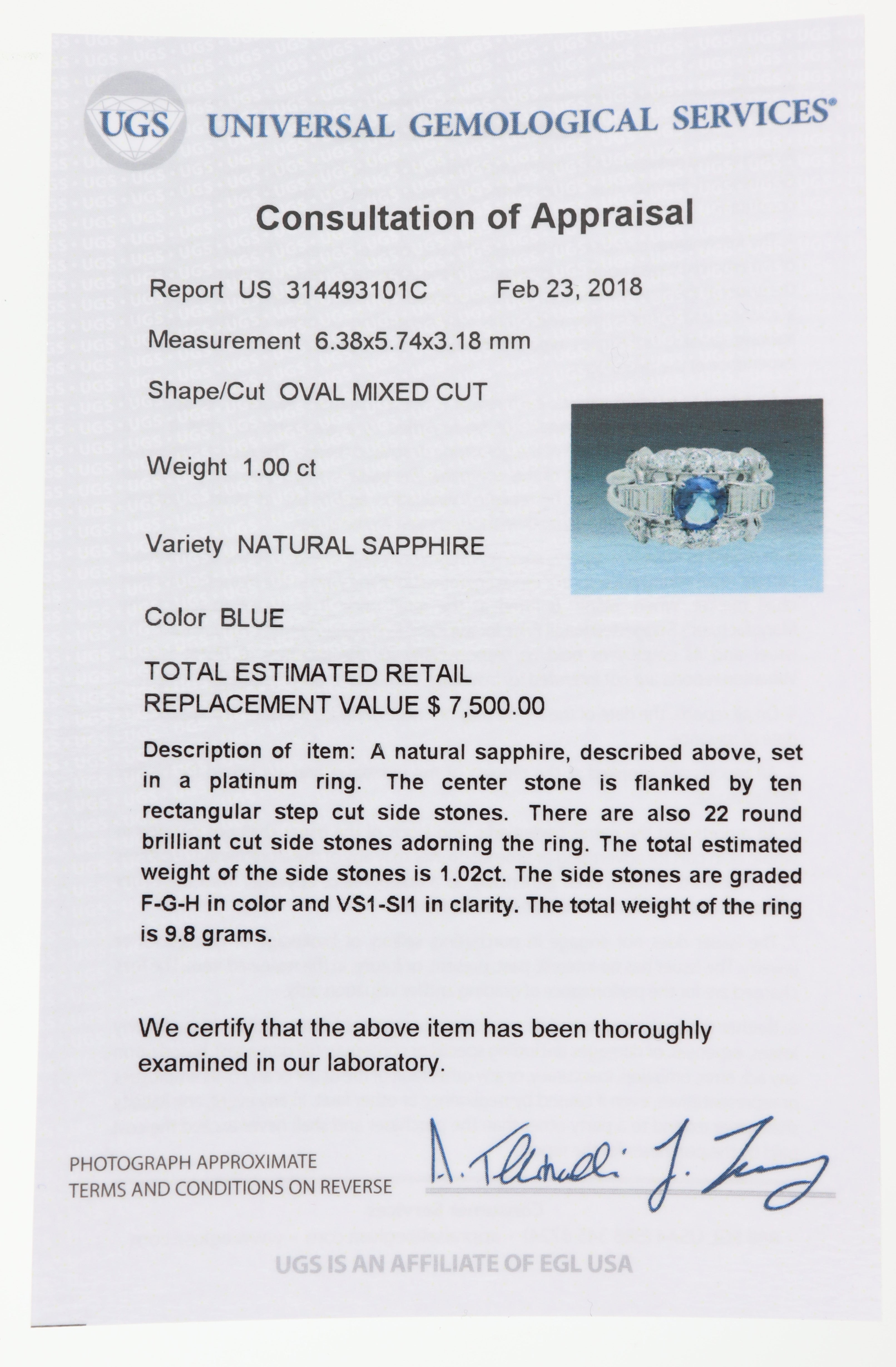 This is a beautiful 1940s Antique Art Deco Platinum 2.02ct Unheated Ceylon Sapphire Diamond Engagement Ring. This ring diamonds were graded by EGL-USA and has an estimated retail value of $7,500.00 that was determined by UGS an independent appraisal company. It will come in a lovely ring box for a perfect presentation and our unconditional 30 day money back return policy.