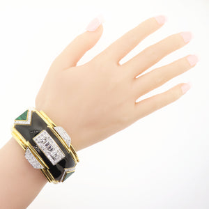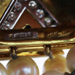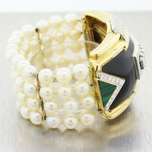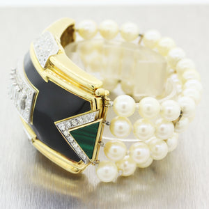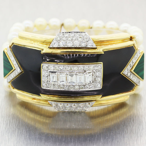 Pearls - 7mm (approx.) Diamonds - Round & Emerald Cut - GH/SI1SI2 - 10ctw (approx.) Black Enamel Malachite - 15mm x 9mm (approx.) |