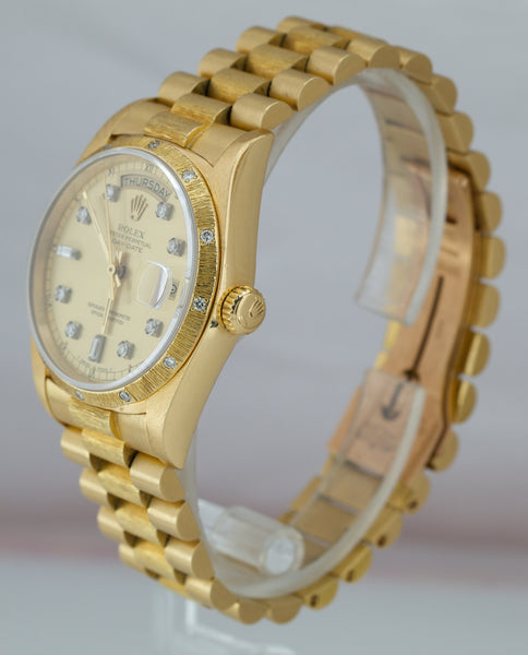 1987 Rolex Day-Date President 18038 Diamond Bark 36mm 18K Yellow Gold Watch