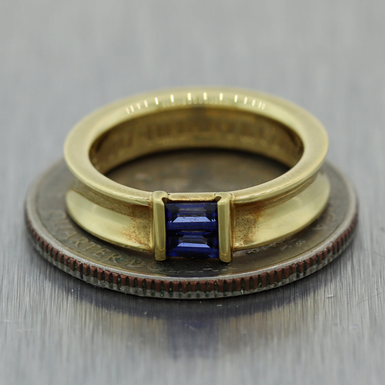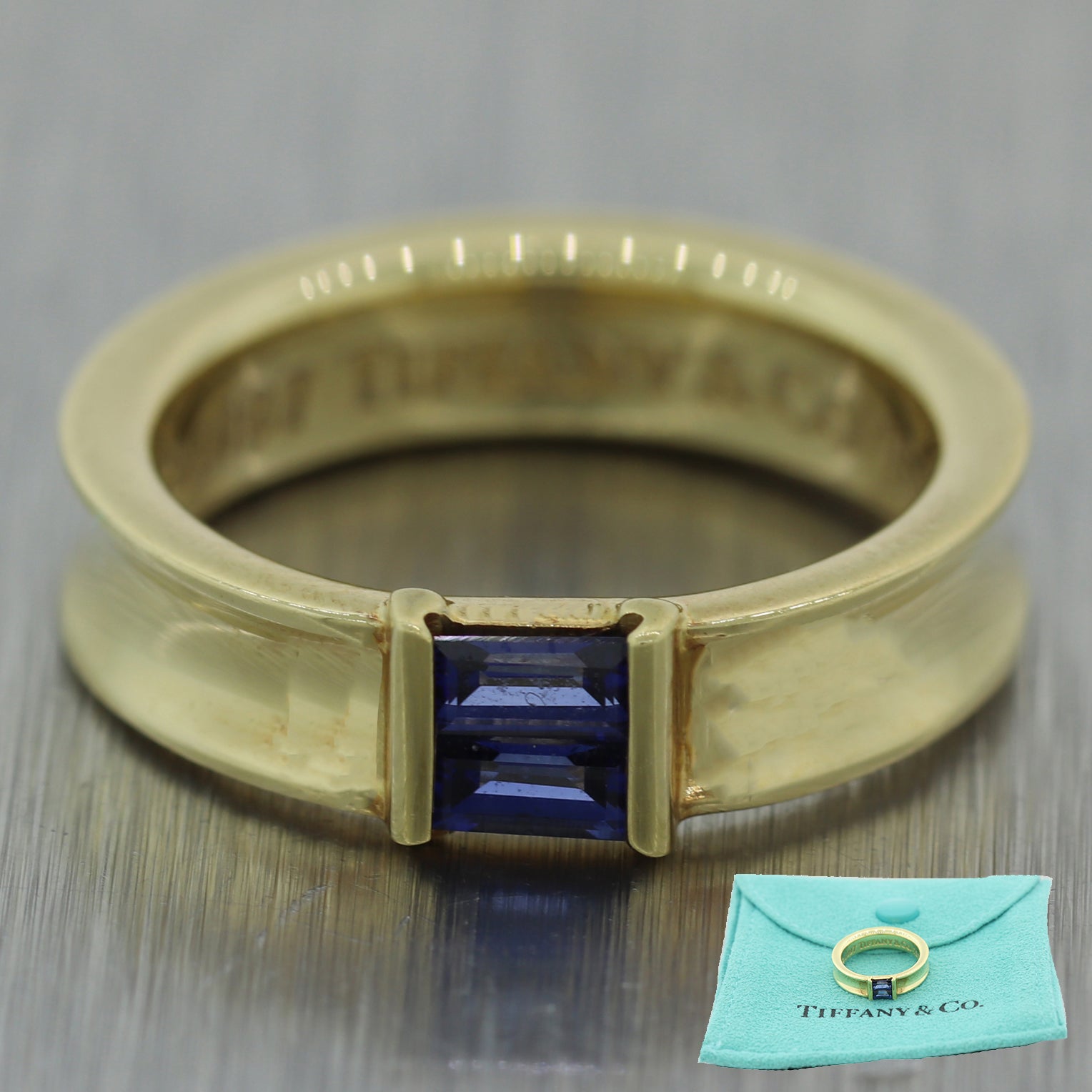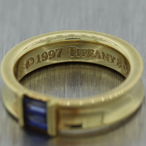 For your consideration, an authentic and original 1997 Tiffany & Co. 18k Yellow Gold 0.20ctw Baguette Cut Sapphire Band Ring. This piece will come in a lovely ring box for a perfect presentation and our unconditional 30 day money back return policy. A1