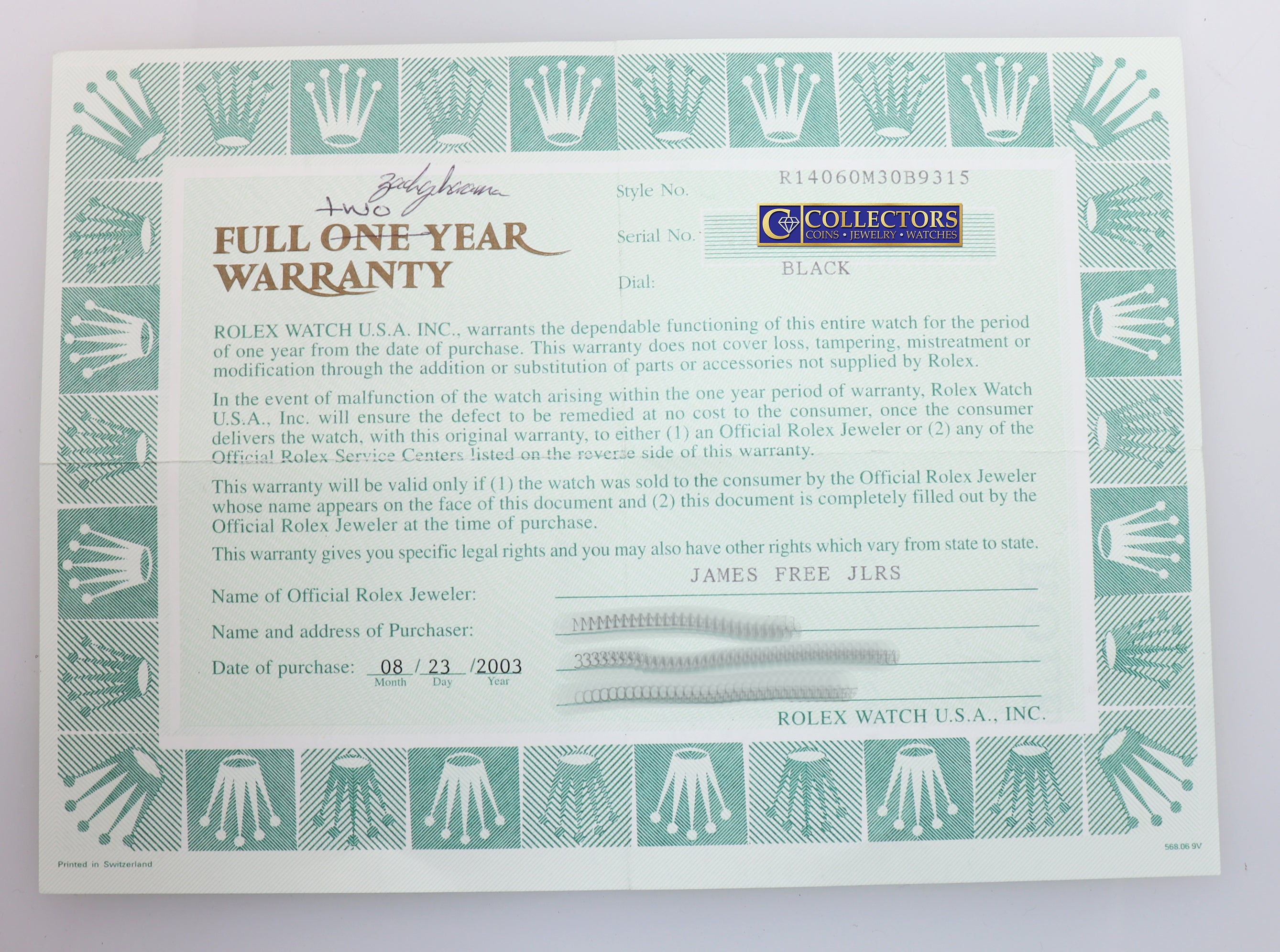 | Papers | Yes, this item will include the Original Rolex Warranty Papers and a Collectors Coins & Jewelry certificate of appraisal and authenticity as per buyer request. |