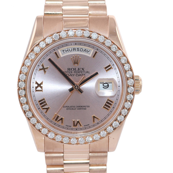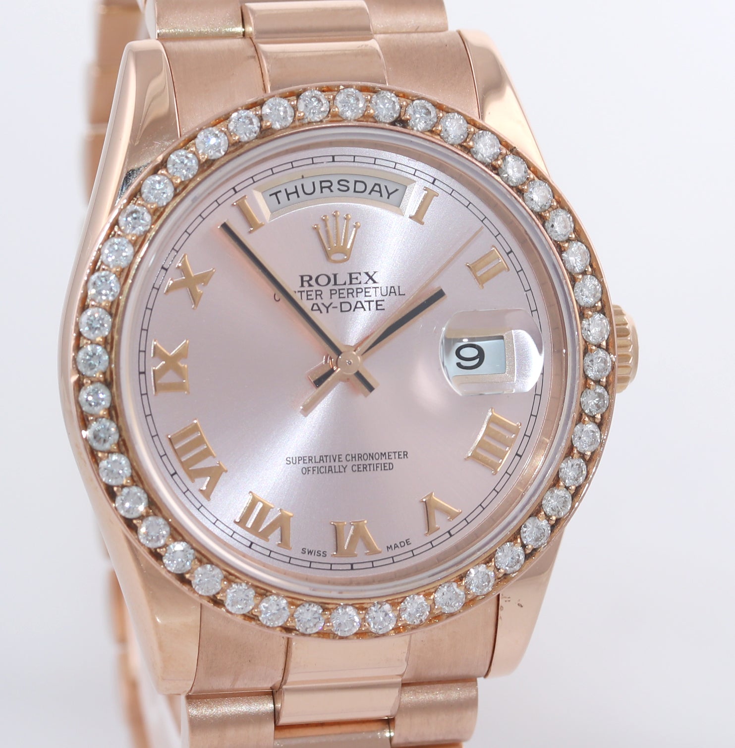 | Dial | Original Rolex Pink RomanDial with the day at the 12 o'clock and the date at the 3 o'clock |