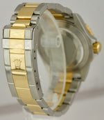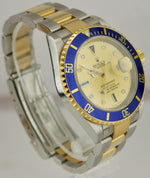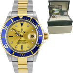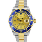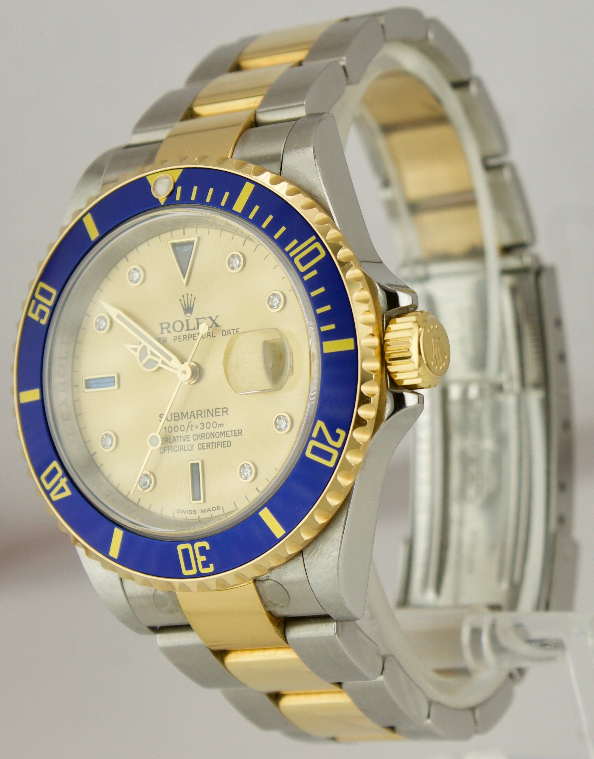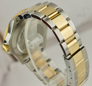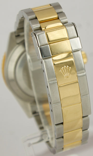 This is the RARE last year of the 16613 reference number which features an inner-bezel (flange/rehaut) engraving including "ROLEX" several times and the watch's unique serial number! This watch also features a no-holes case, solid end links and gold through the buckle!)