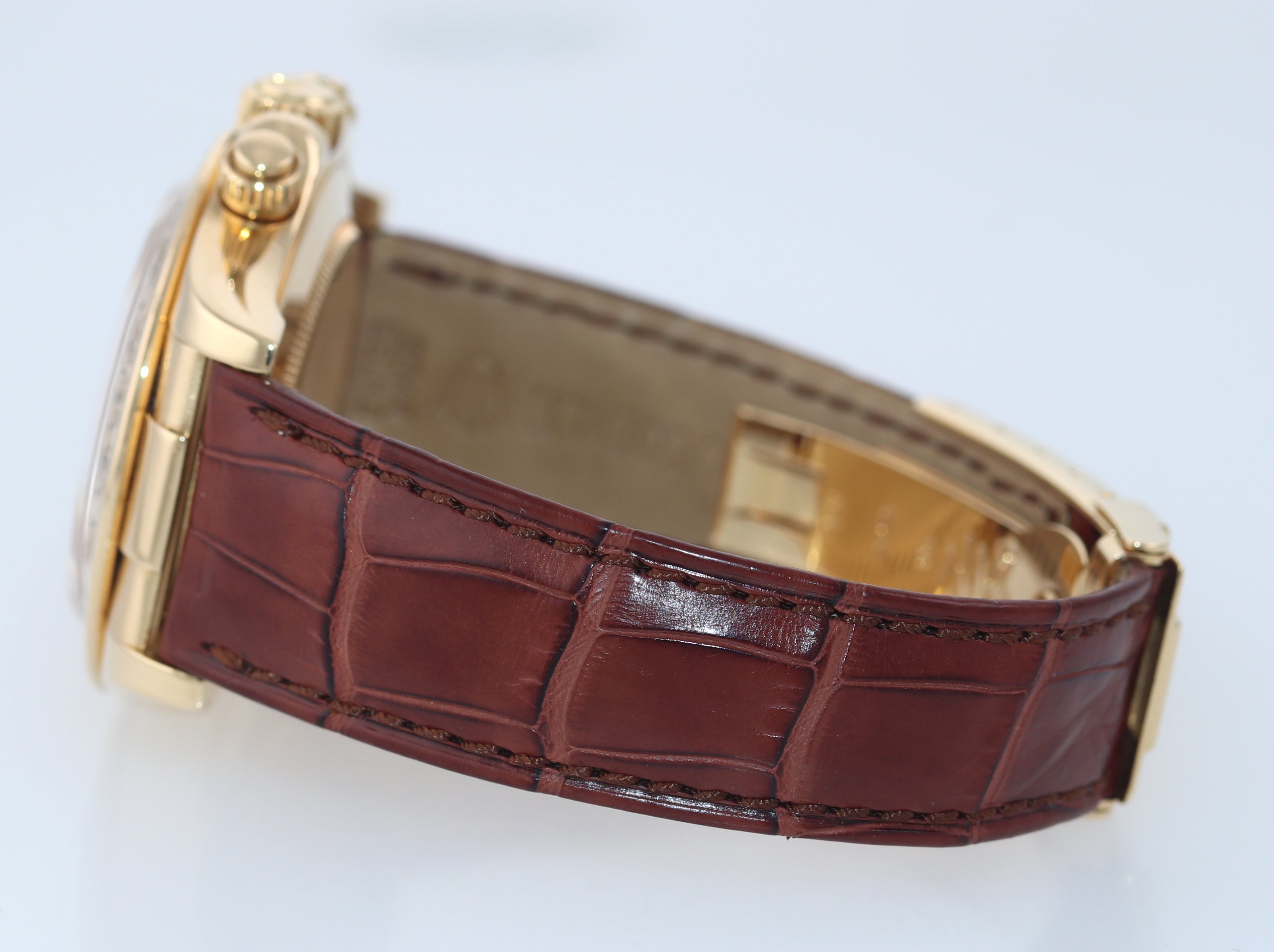 | Band | Original Rolex Genuine Brown Alligator Leather Band with an 18K Yellow Gold Flip Lock Deployment Clasp. Band is in Excellent condition |