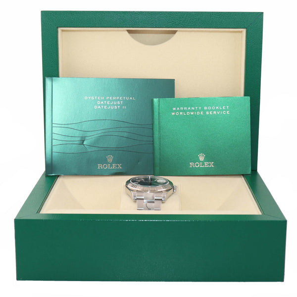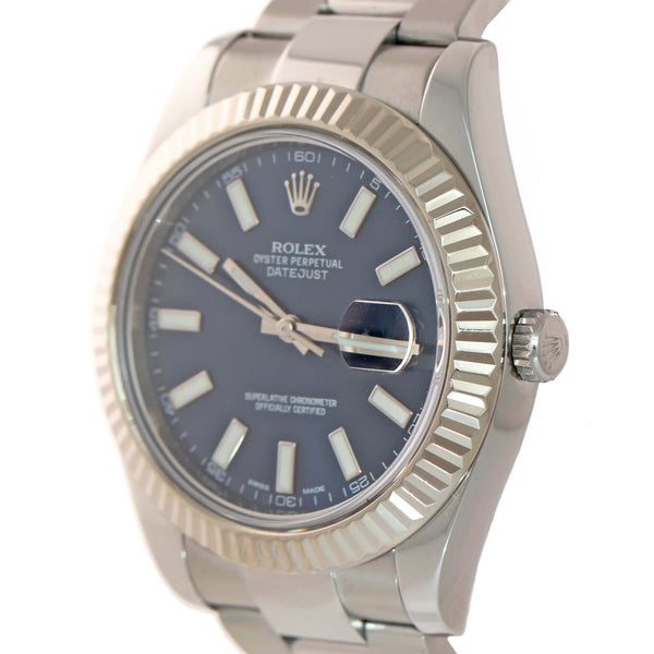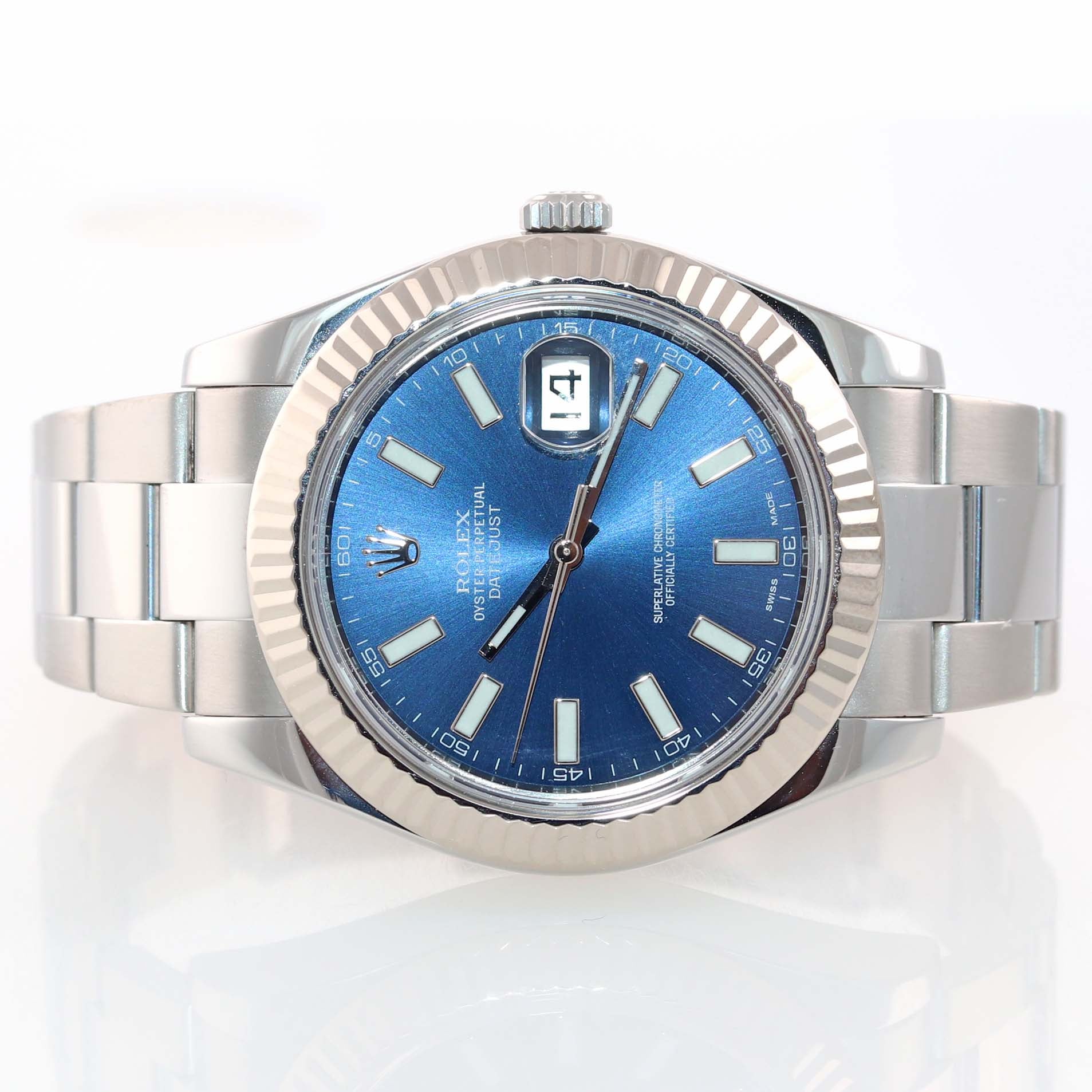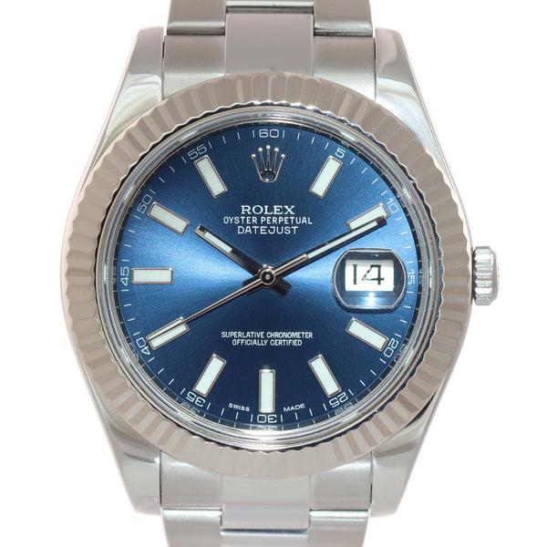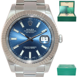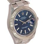 Rolex Datejust 2 Blue Stick Dial 41mm 18k White Gold Fluted Bezel Stainless Steel 116334 Watch Box