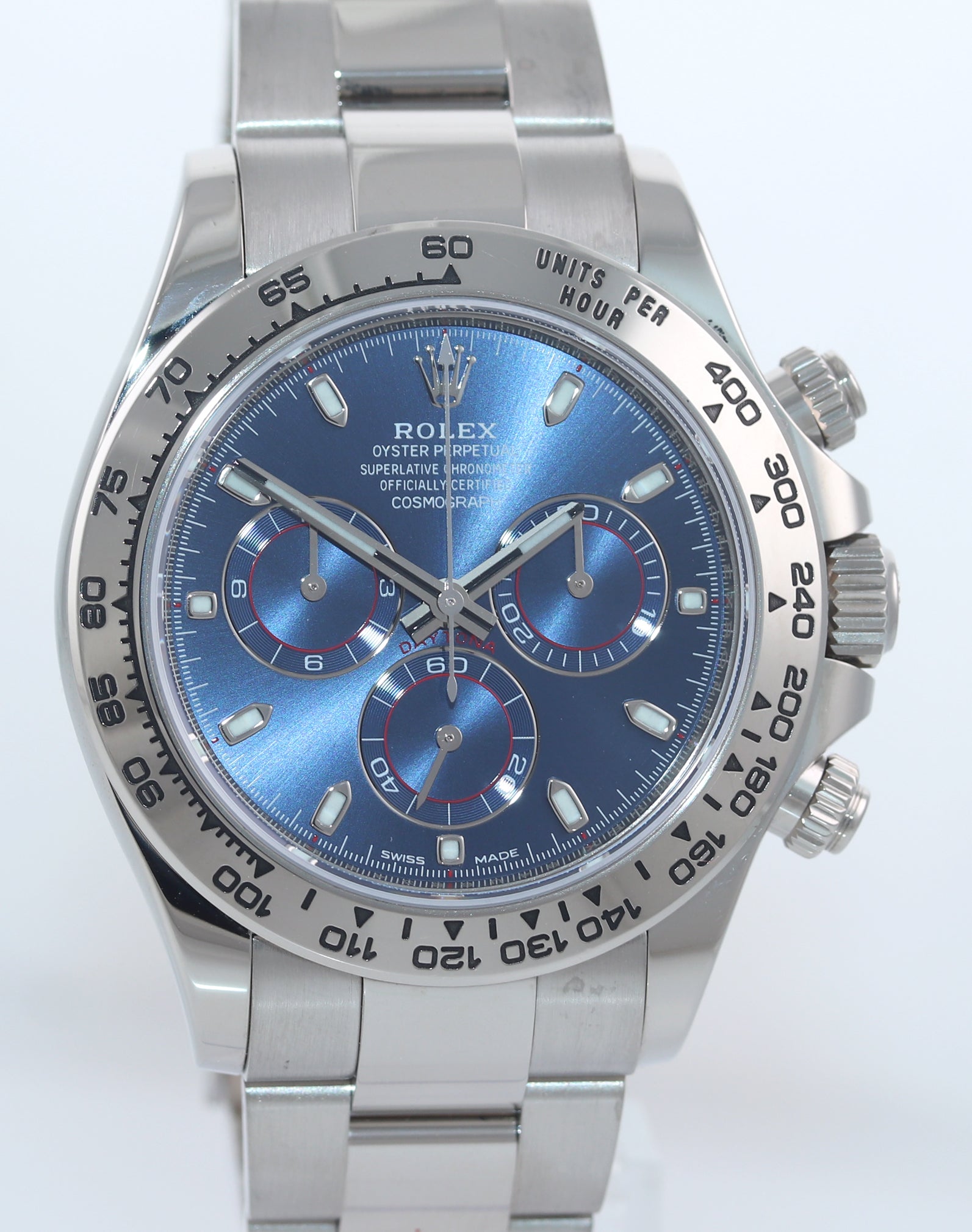 | Bezel | Original Rolex 18K White Gold Bezel with an engraved tachymetric scale in excellent condition. |