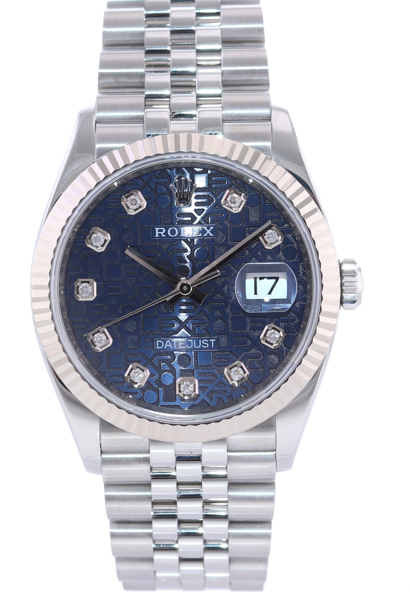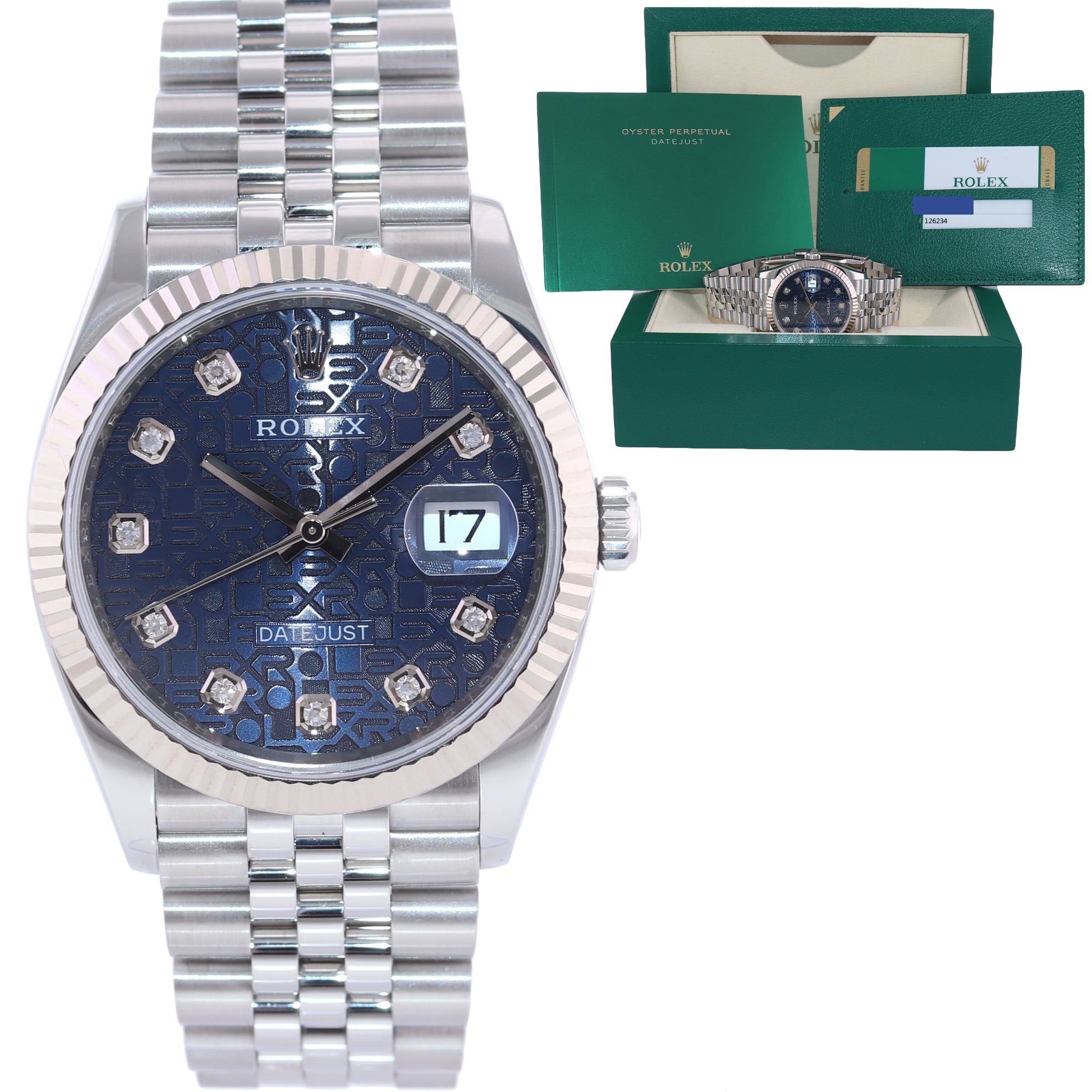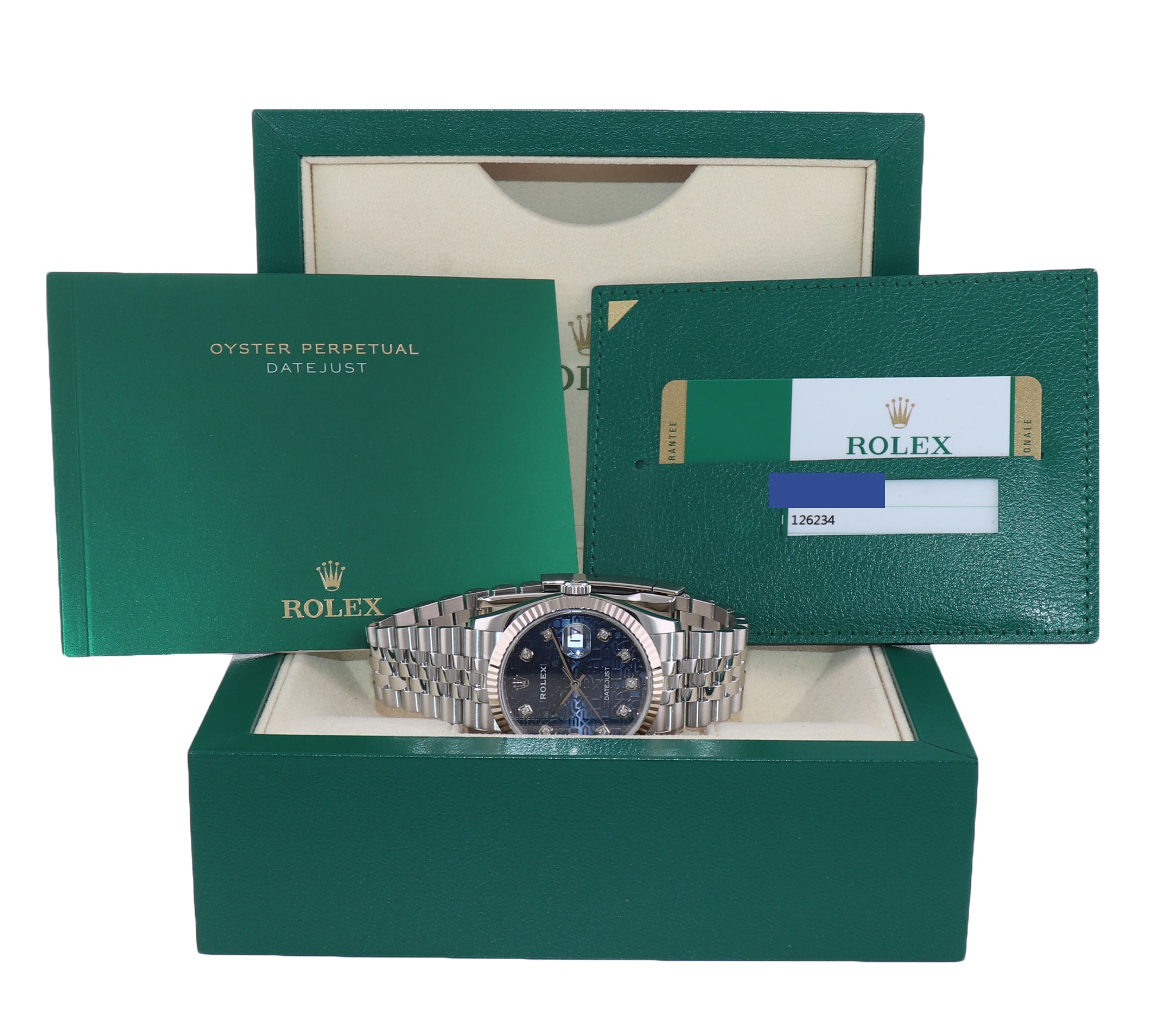 | Dial | Rolex Blue Jubilee Diamond Dial with the date at the 3 o'clock |