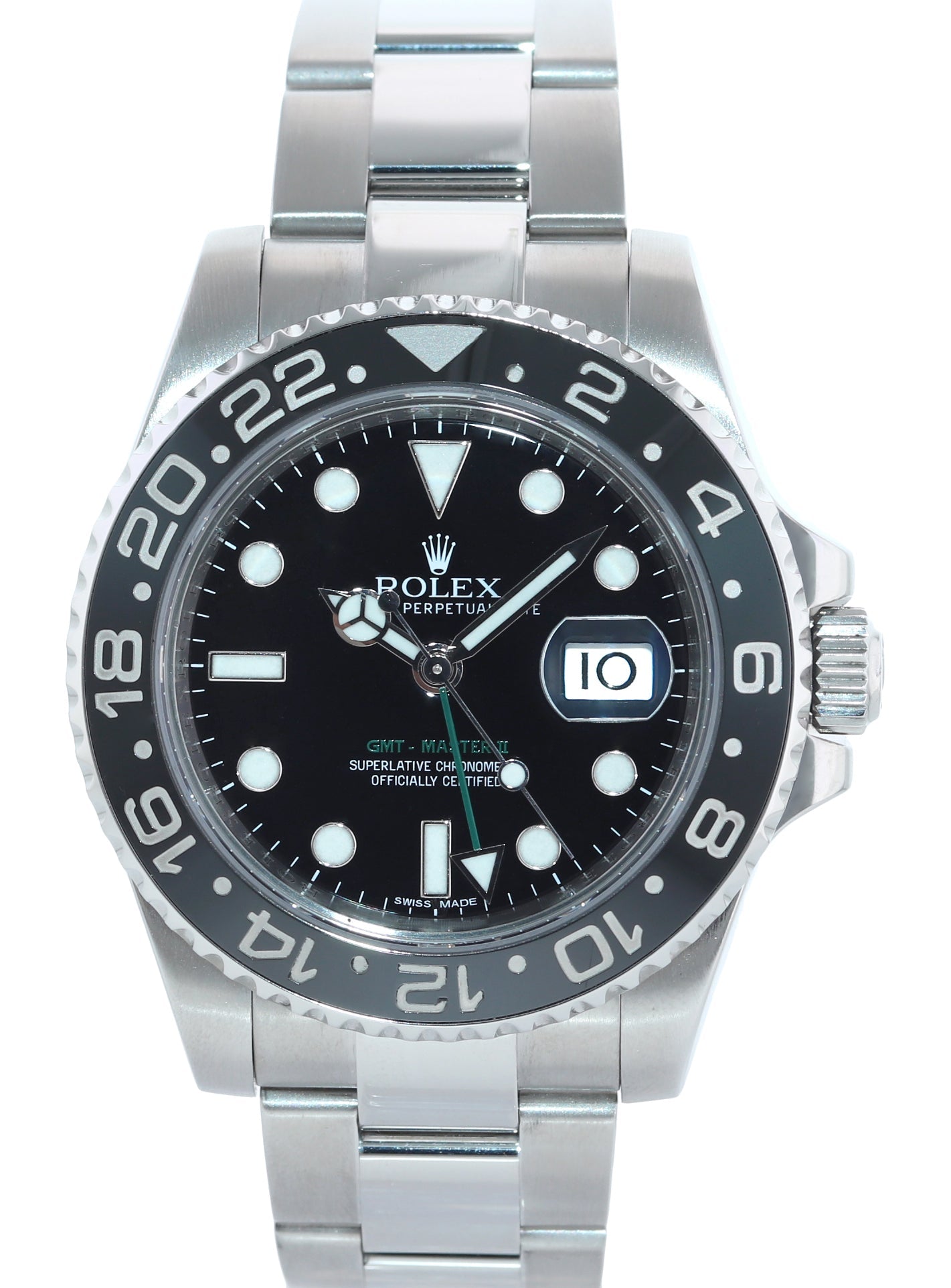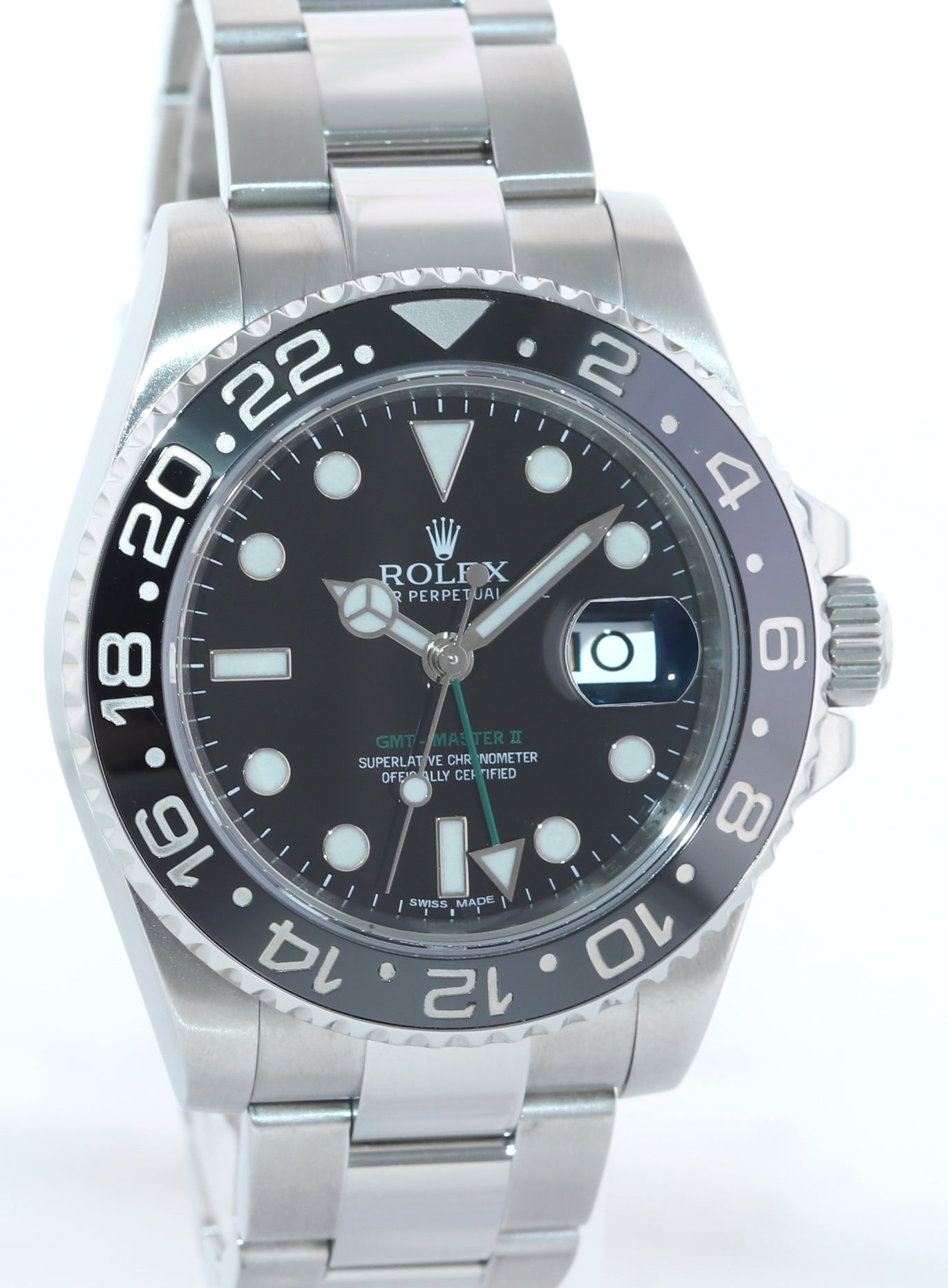 | Dial | Rolex Black Index Dial with date at the 3 o'clock and a Green 24-hour GMT (second time-zone) hand. DIAL HAS SOME WEAR AT THE 11 O'CLOCK |