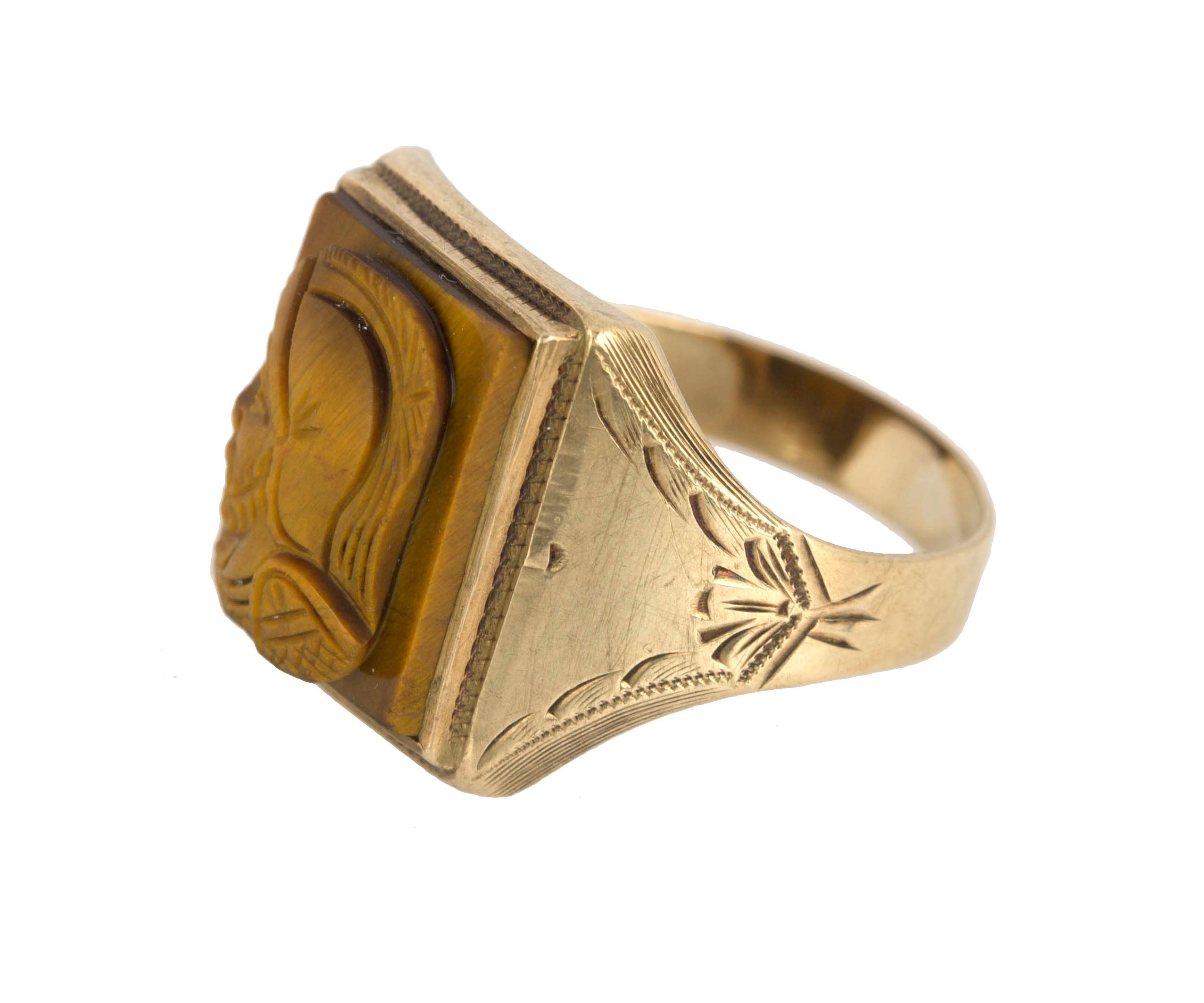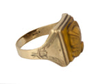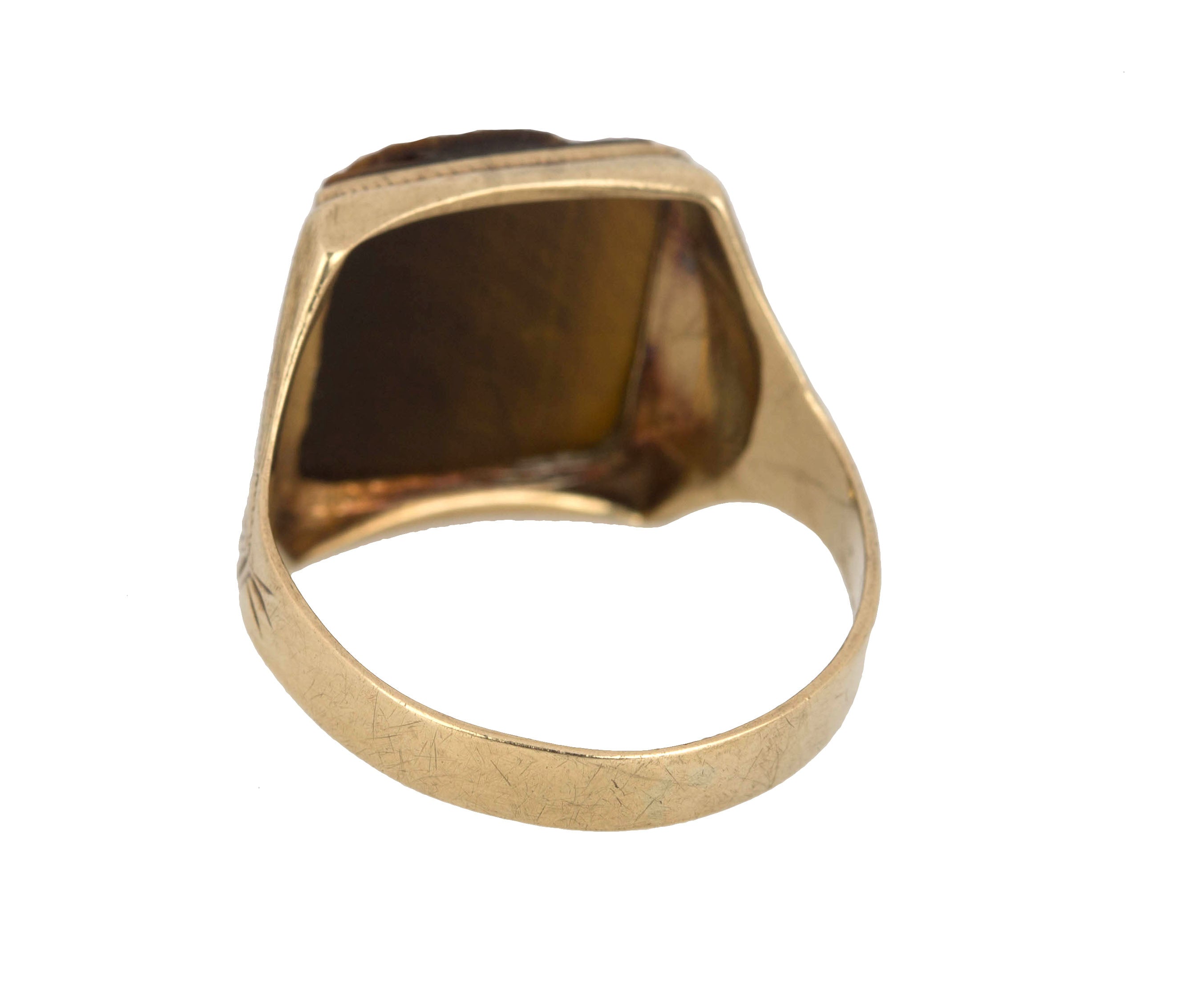 Antique Art Deco 10K Yellow Gold Tigers Eye Intaglio Roman Soldier Carved Ring