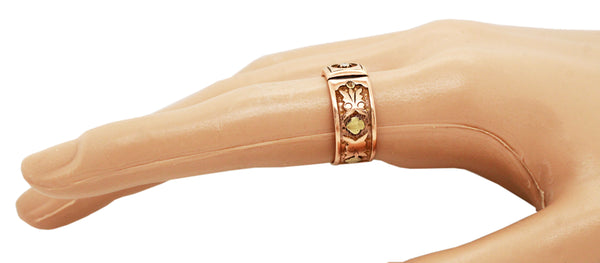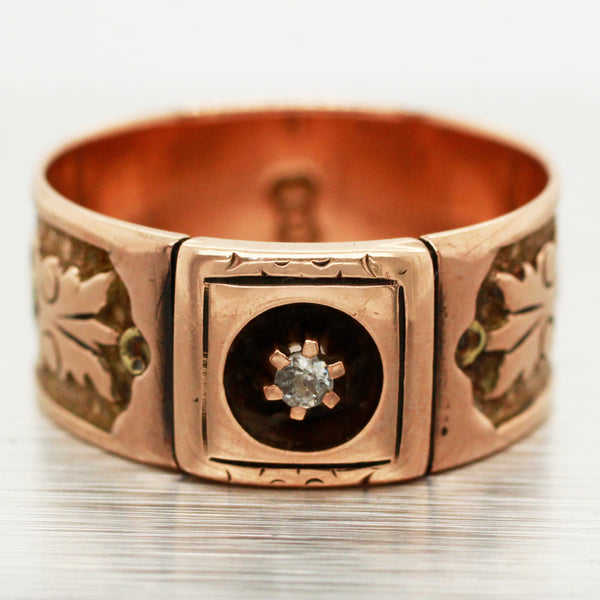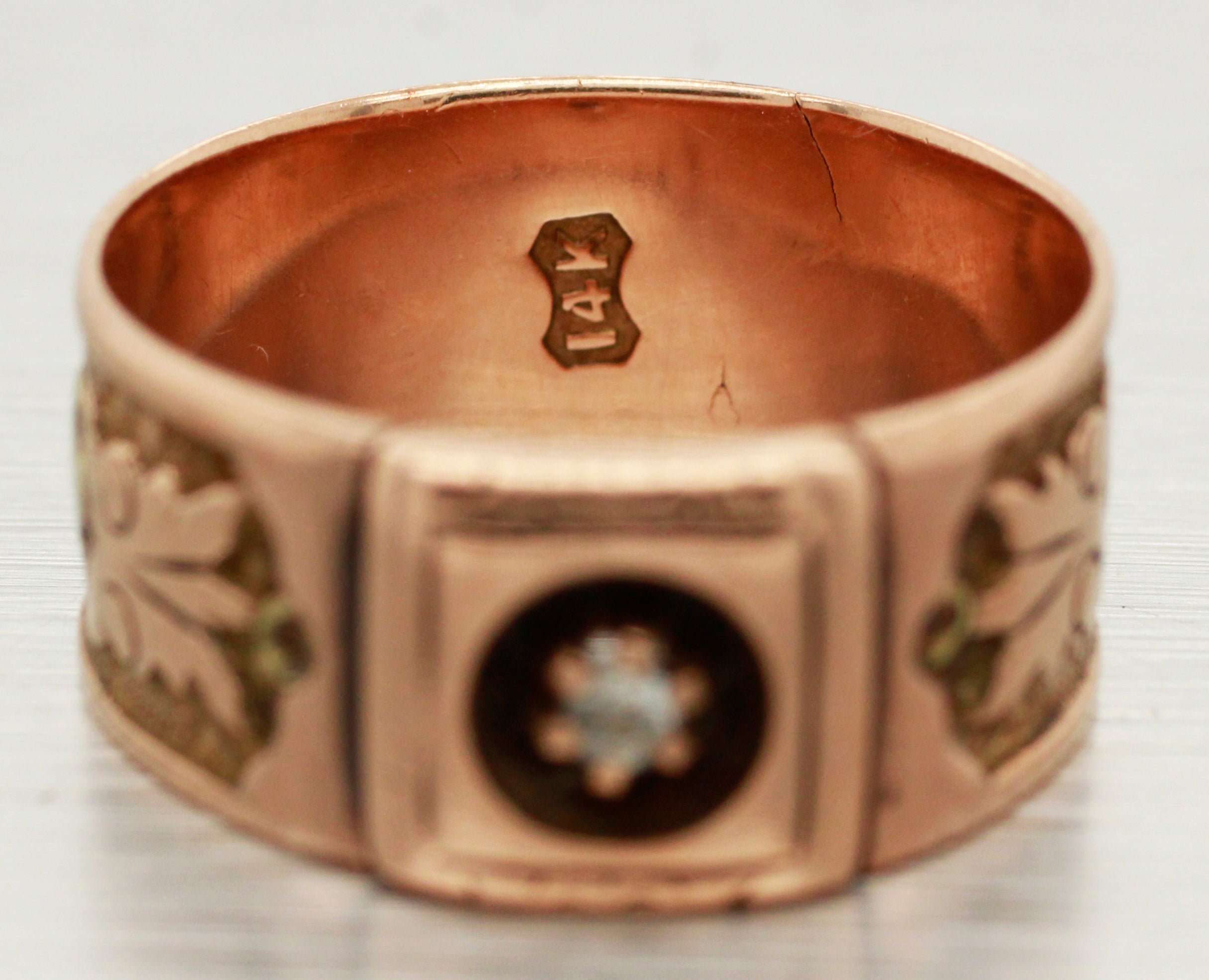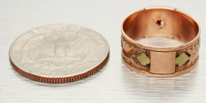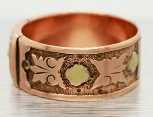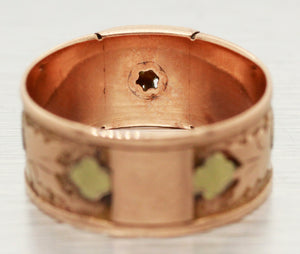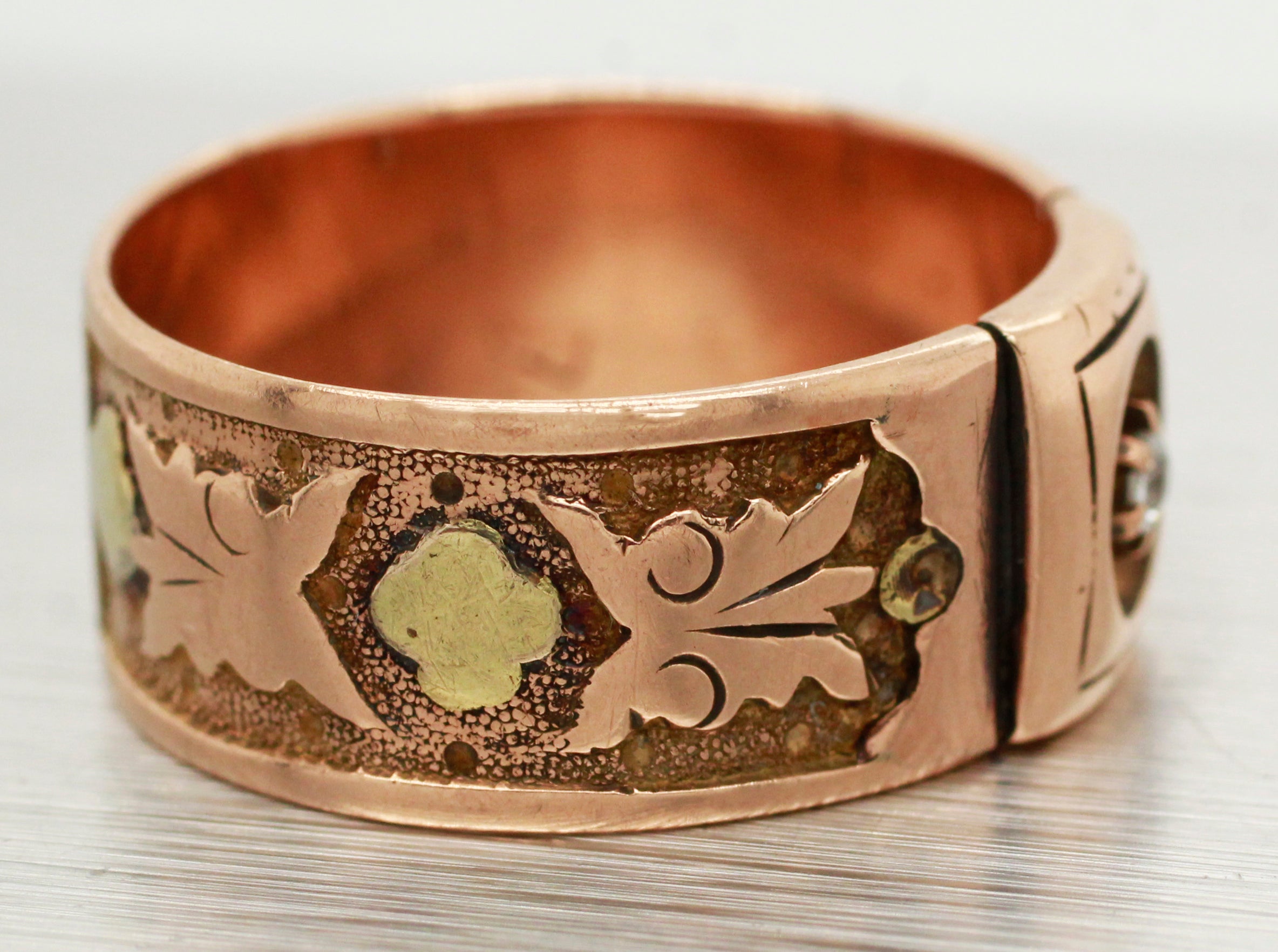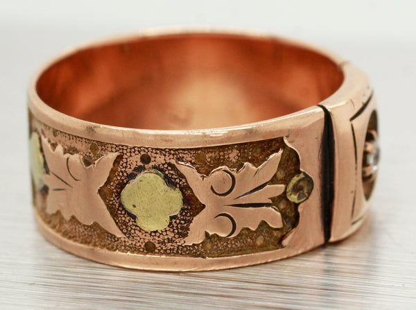 This gorgeous ring is over 100 years old and is still in excellent condition. A relic of the Art Nouveau movement, this band features ornate designs and trefoil patterns, crafted from two different tones of solid gold. This ring has been minimally restored to preserve its antiquity.