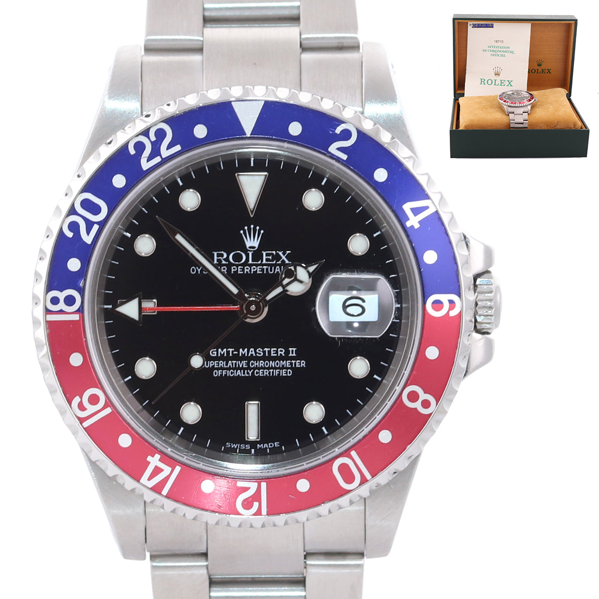 PAPERS BLRO Rolex GMT-Master II Pepsi Red Blue Stainless 16710 40mm Date Watch with Original Papers Box.