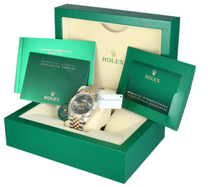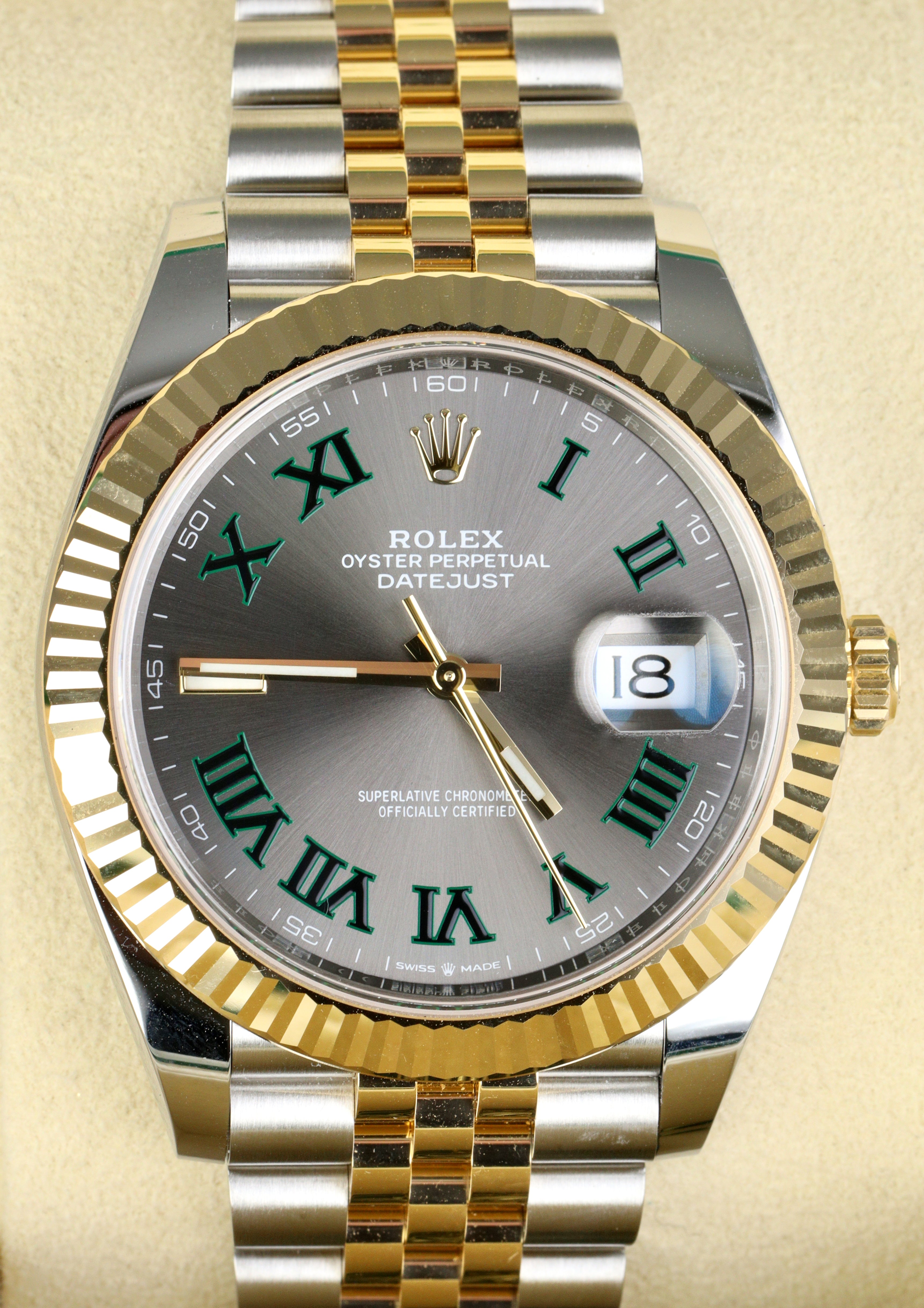 | Dial | Original Rolex WIMBLEDON Gray/Slate Green Roman Numeral Dial with the date at the 3 o'clock |