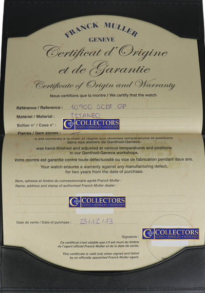 | Dial | Original Frank Muller Black Arabic Dial with the date at the 6 o'clock | |