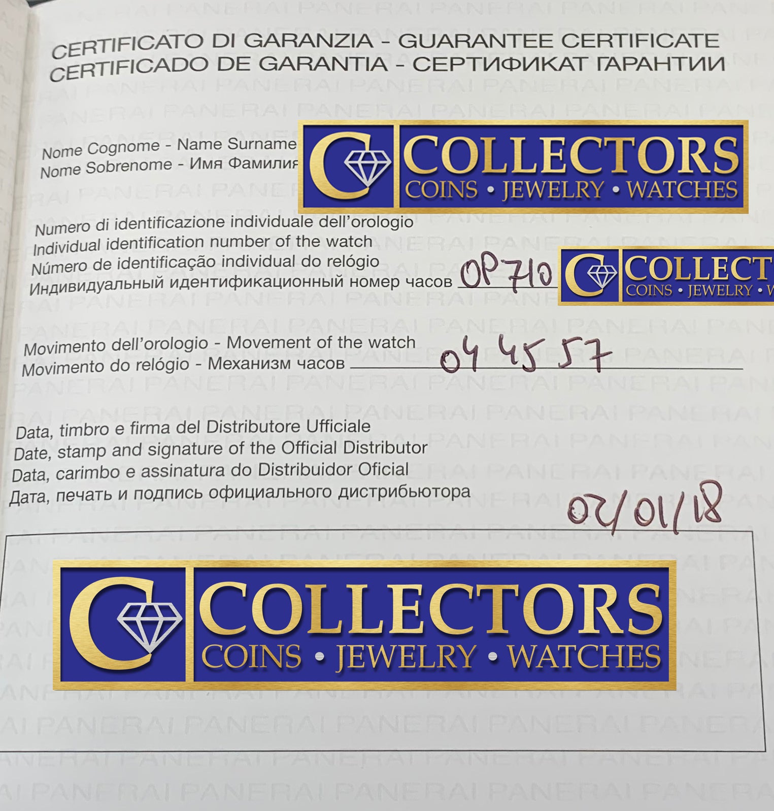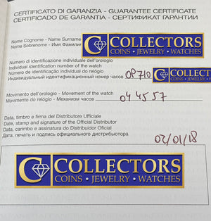 One-Year Warranty ($400 Value - Included with your purchase). Collectors Coins & Jewelry warrants the dependable functioning of this entire watch for the period of one year from the date of purchase. This warranty does not cover normal wear and tear, loss, theft, tampering, mistreatment or modification through the addition or subtraction of parts or accessories not supplied by Collectors Coins & Jewelry. In the event of a malfunction arising within the warranty period, we will remedy the defect at no cost to the consumer, once the consumer delivers the watch to our office location in Smithtown, NY address listed to the right of this page. This warranty will be valid only if the consumer holds a certificate of authenticity from Collectors Coins & Jewelry of Smithtown or has another form of proof of purchase. |