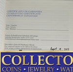 One-Year Warranty ($400 Value - Included with your purchase). Collectors Coins & Jewelry warrants the dependable functioning of this entire watch for the period of one year from the date of purchase. This warranty does not cover normal wear and tear, loss, theft, tampering, mistreatment or modification through the addition or subtraction of parts or accessories not supplied by Collectors Coins & Jewelry. In the event of a malfunction arising within the warranty period, we will remedy the defect at no cost to the consumer, once the consumer delivers the watch to our office location in Smithtown, NY address listed to the right of this page. This warranty will be valid only if the consumer holds a certificate of authenticity from Collectors Coins & Jewelry of Smithtown or has another form of proof of purchase. |