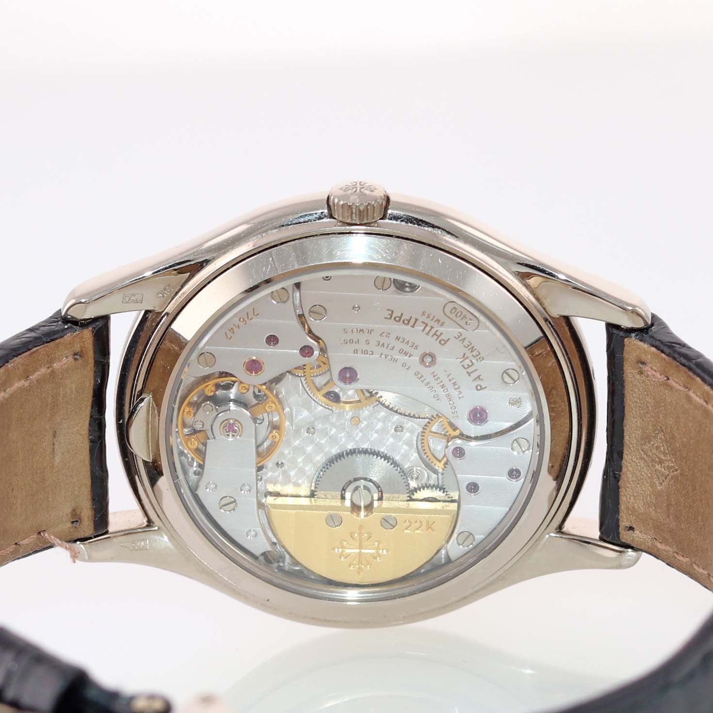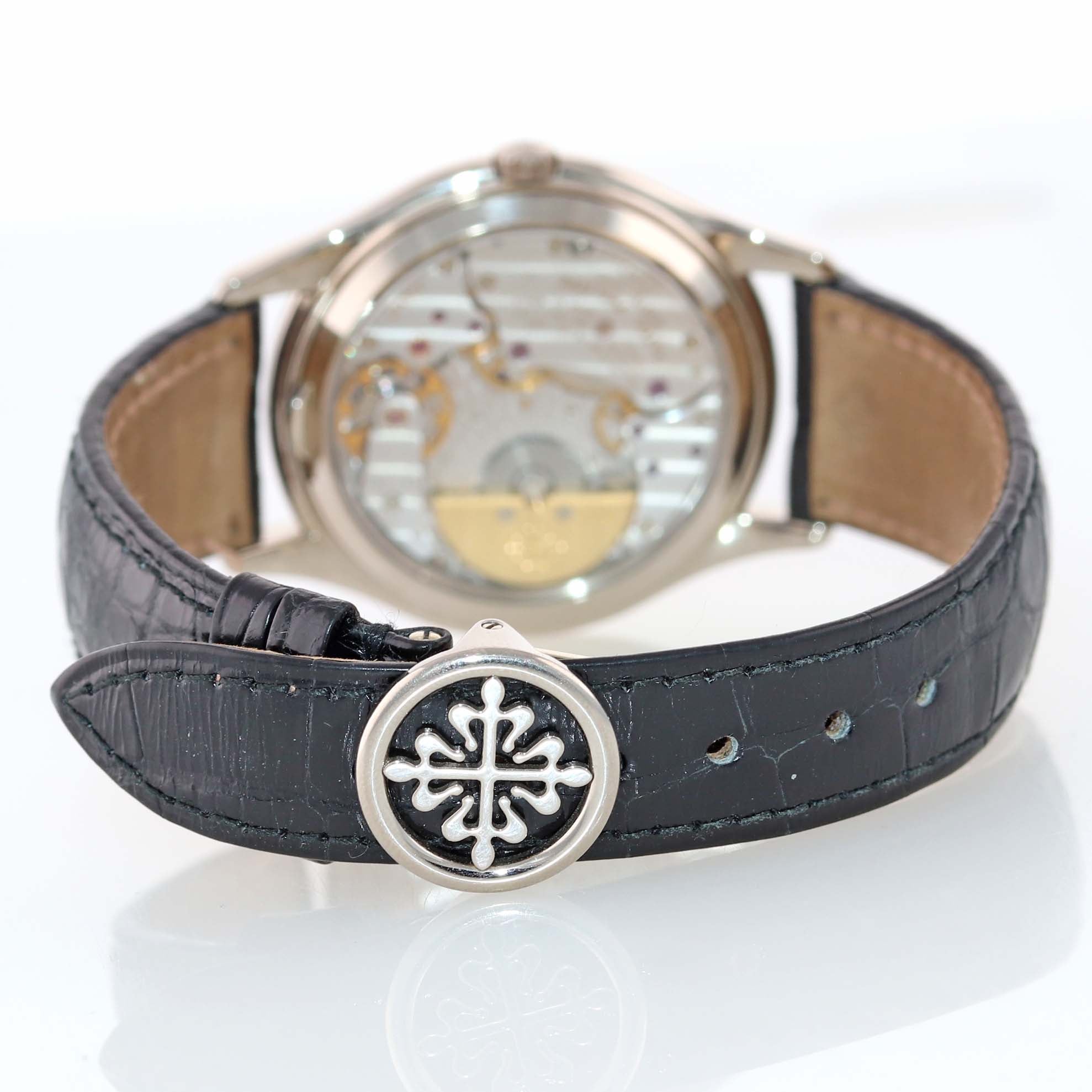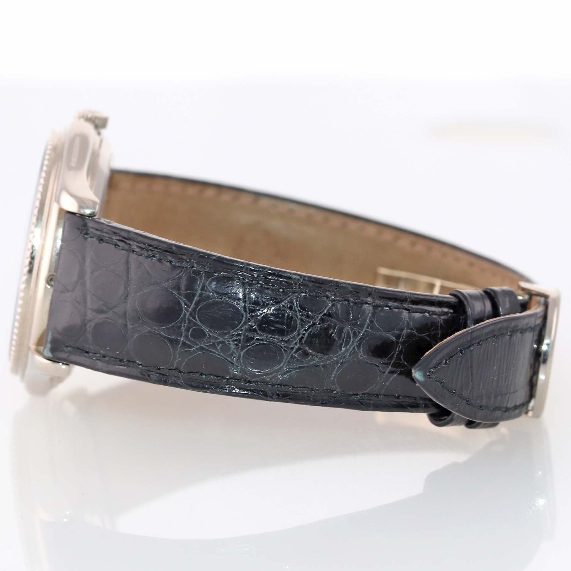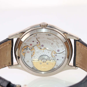 | Band | ORIGINAL Patek Philippe black leather band is in excellent condition on its ORIGINAL Patek Philippe Solid White Gold Deployant Clasp with the Calatrava logo. |