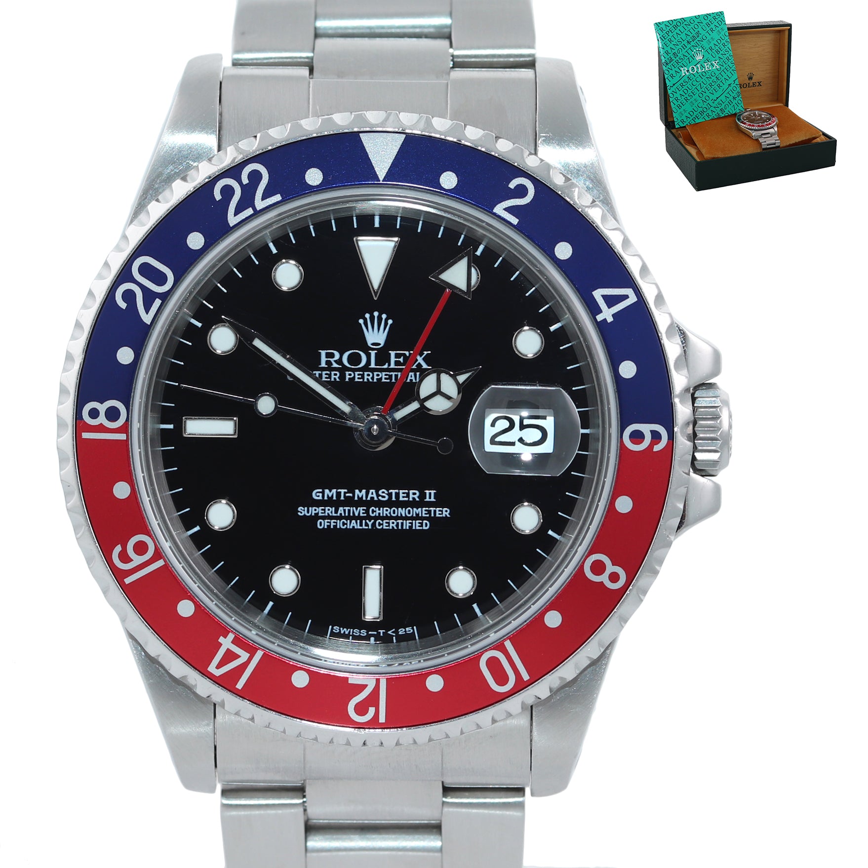 | Dial | Original Rolex Black Index Tritium Dial with date at the 3 o'clock and a Red 24-hour GMT hand |