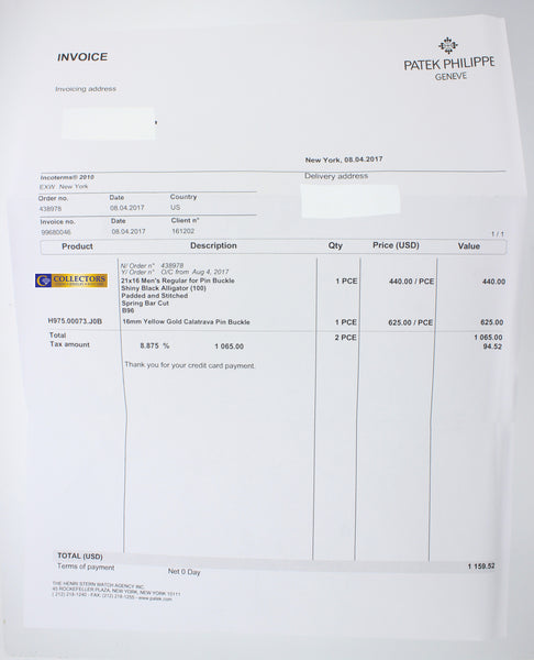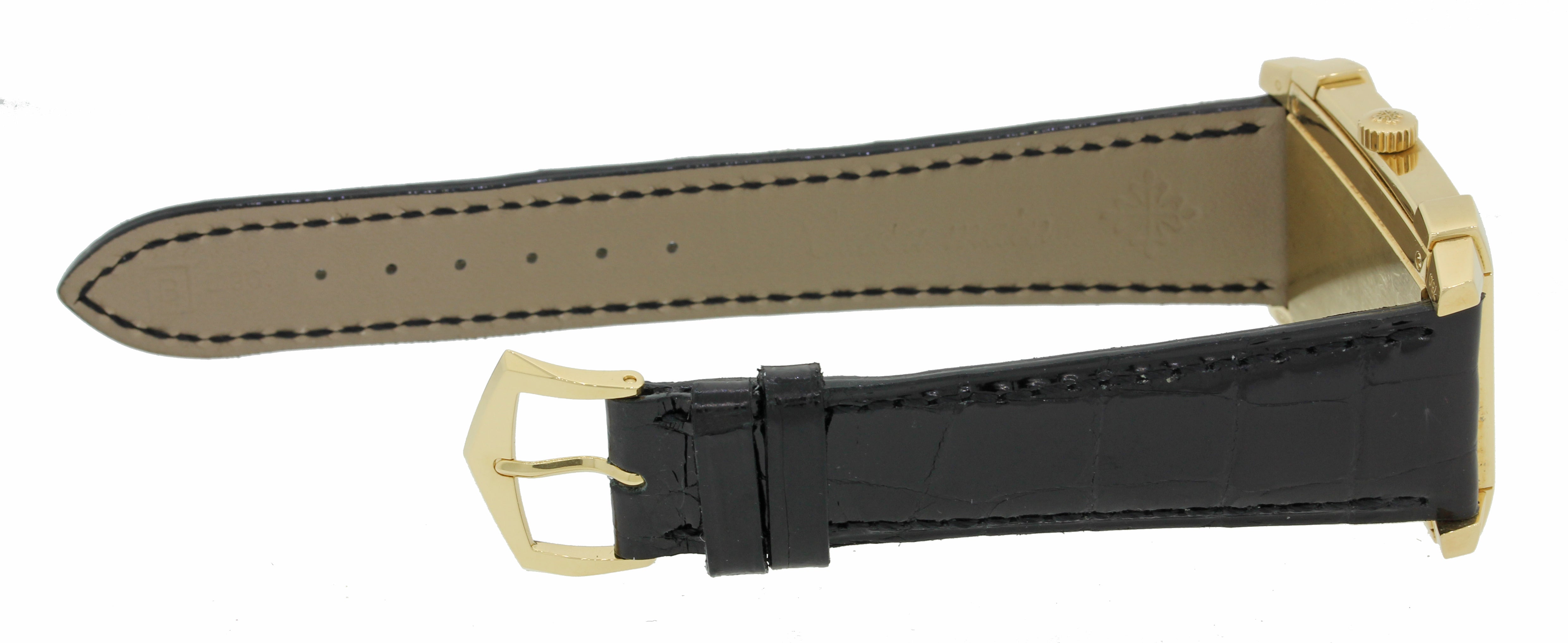 ORIGINAL Patek Philippe BRAND NEW black leather band is UNWORN. ORIGINAL Patek Philippe Solid 18k yellow gold buckle. ORIGINAL Patek Philippe receipt for band included with purchase |