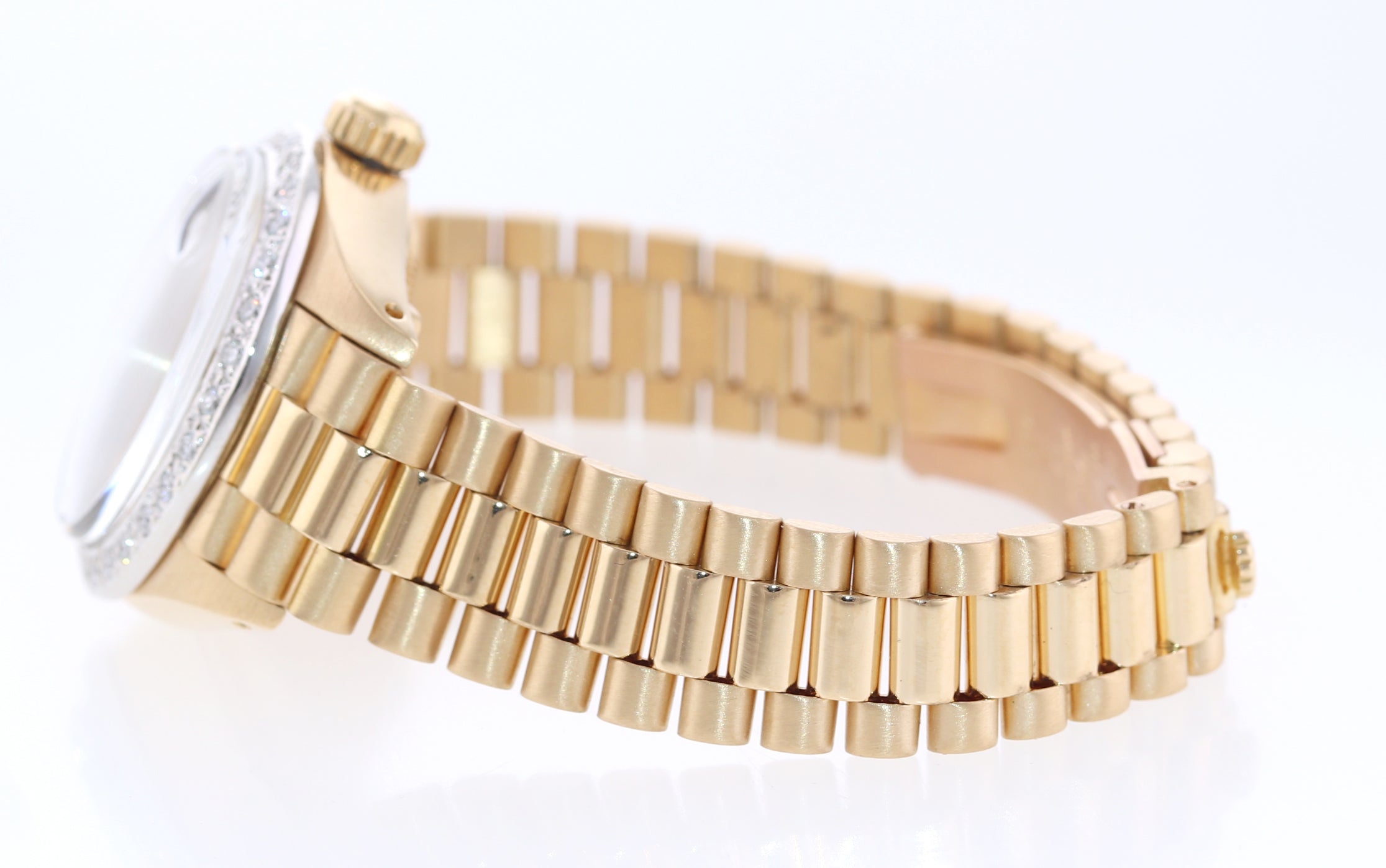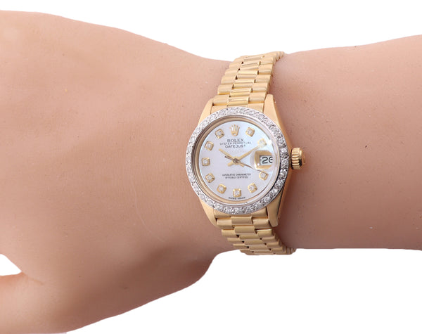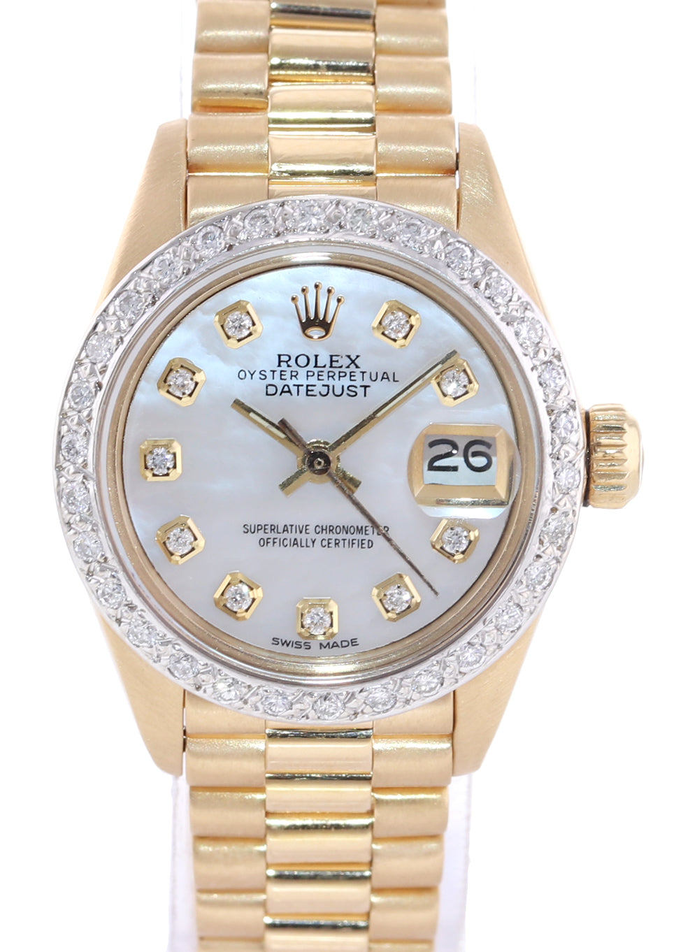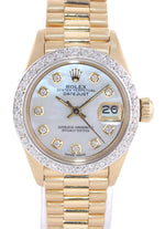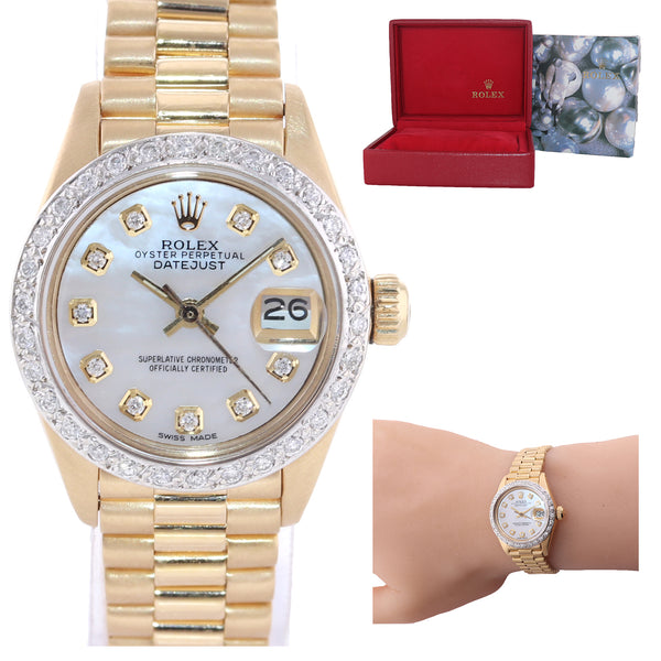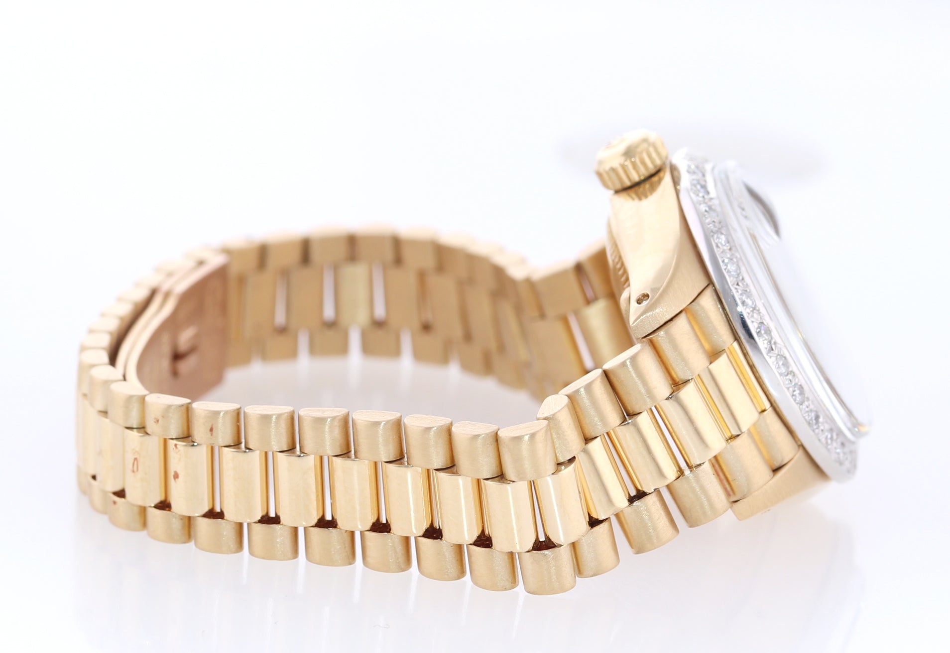 Diamond Bezel Ladies Rolex DateJust President 26mm MOP Diamond 6917 18k Yellow Gold Watch